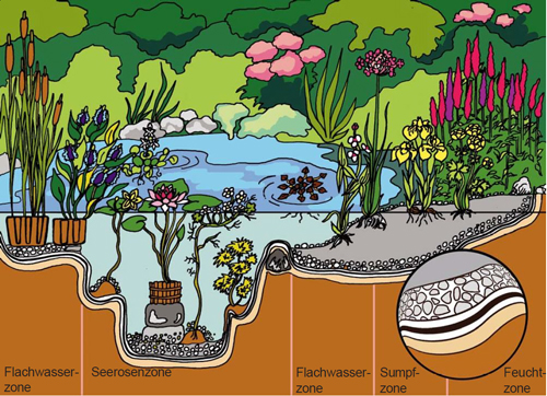 Die Bepflanzung in und ums Wasser wird bestimmt durch den Wasserstand der Pflanzenfläche. Es können 5 verschiedene 'Wasserstandszonen' mit jeweils dafür geeigneten Pfanzen unterschieden werden. Die Artenvielfalt ist gross, somit können sehr individuelle, den Wünschen des Gartenbesitzers angepasste Bereiche mit Stauden, Gräsern, Farnen und in der Gartenzone auch Gehölzen angelegt werden.