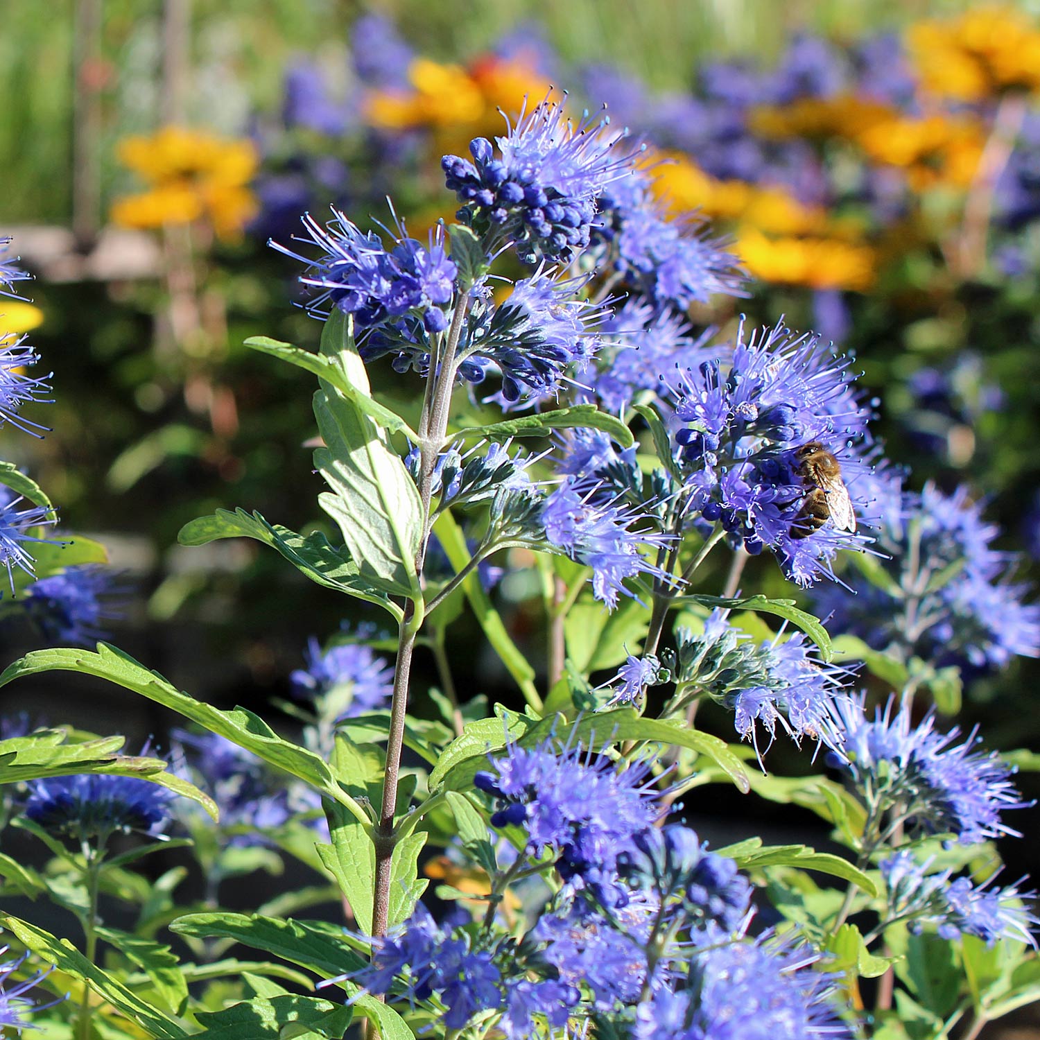 Die blauen Blüten der Bartblume sehen wunderschön aus im Garten und ziehen Bienen magisch an. Der Halbstrauch blüht von Juli bis September. Die Bartblume bevorzugt einen sonnigen Standort und frischen, gut durchlässigen Boden. Sie macht sich gut im Staudenbeet und ist auch für Kübel geeignet, da sie auch Trockenheit verträgt. Im Frühling sollte sie etwa handbreit über dem Boden abgeschnitten werden. Ansonsten benötigt sie keine Pflege.