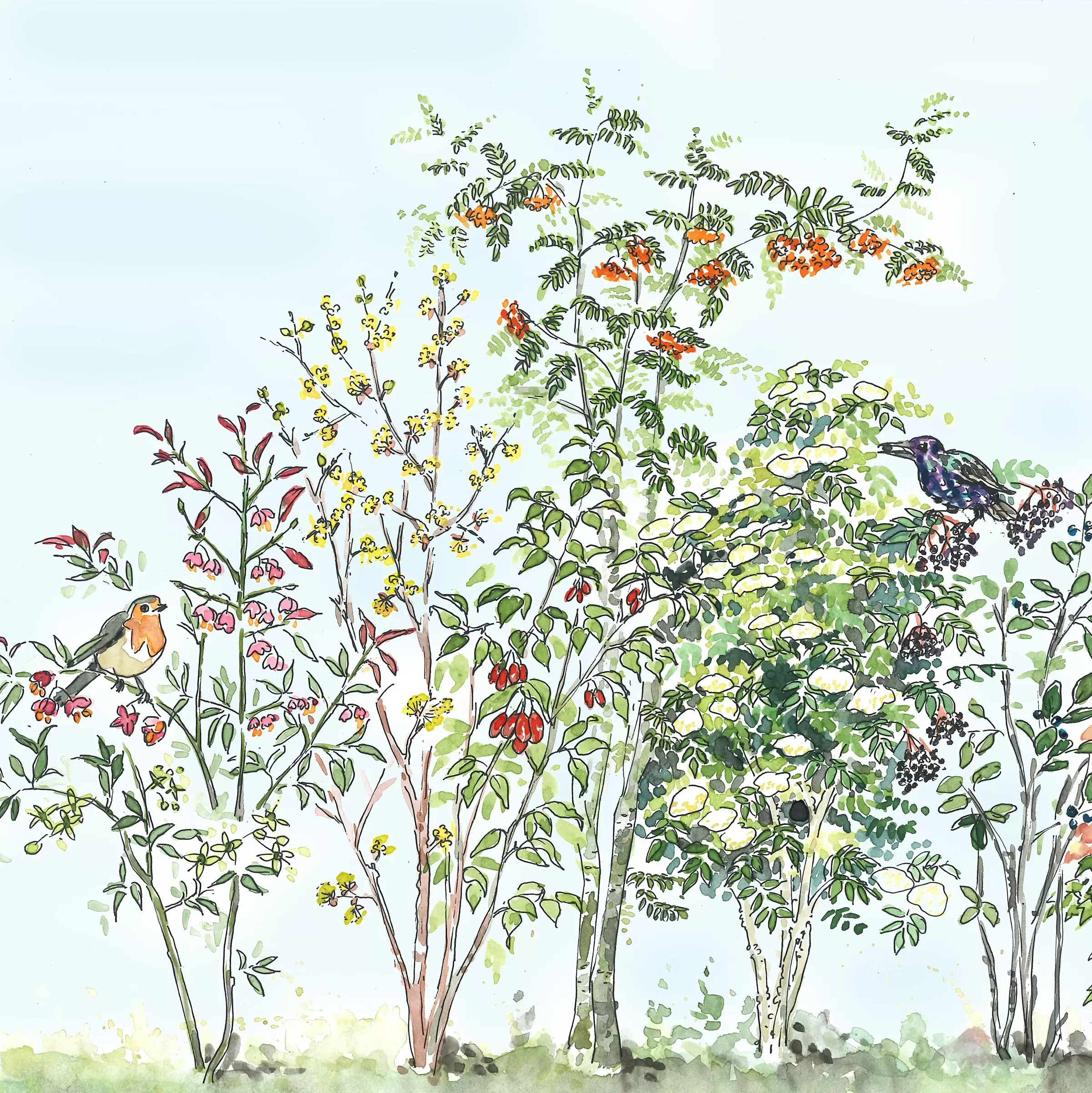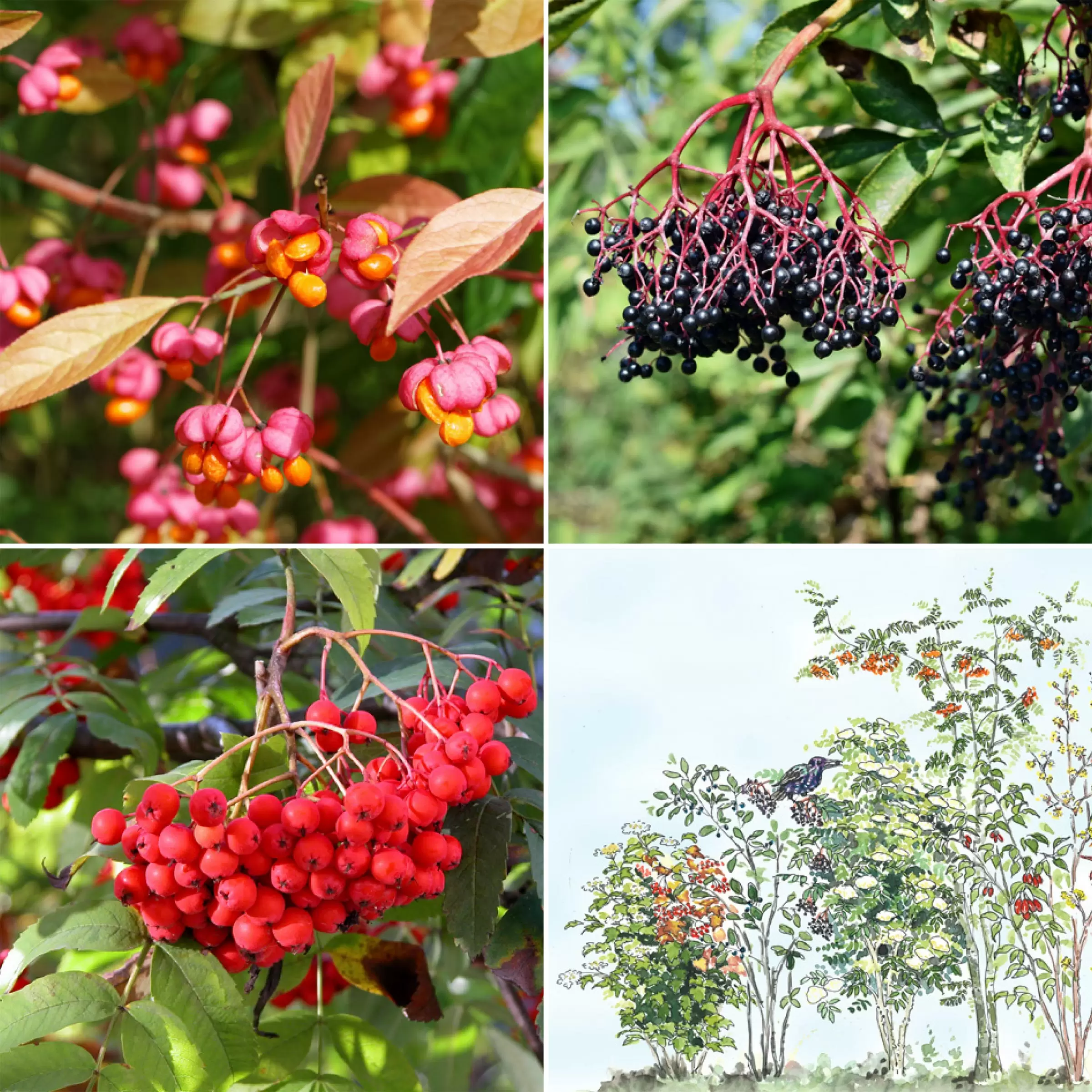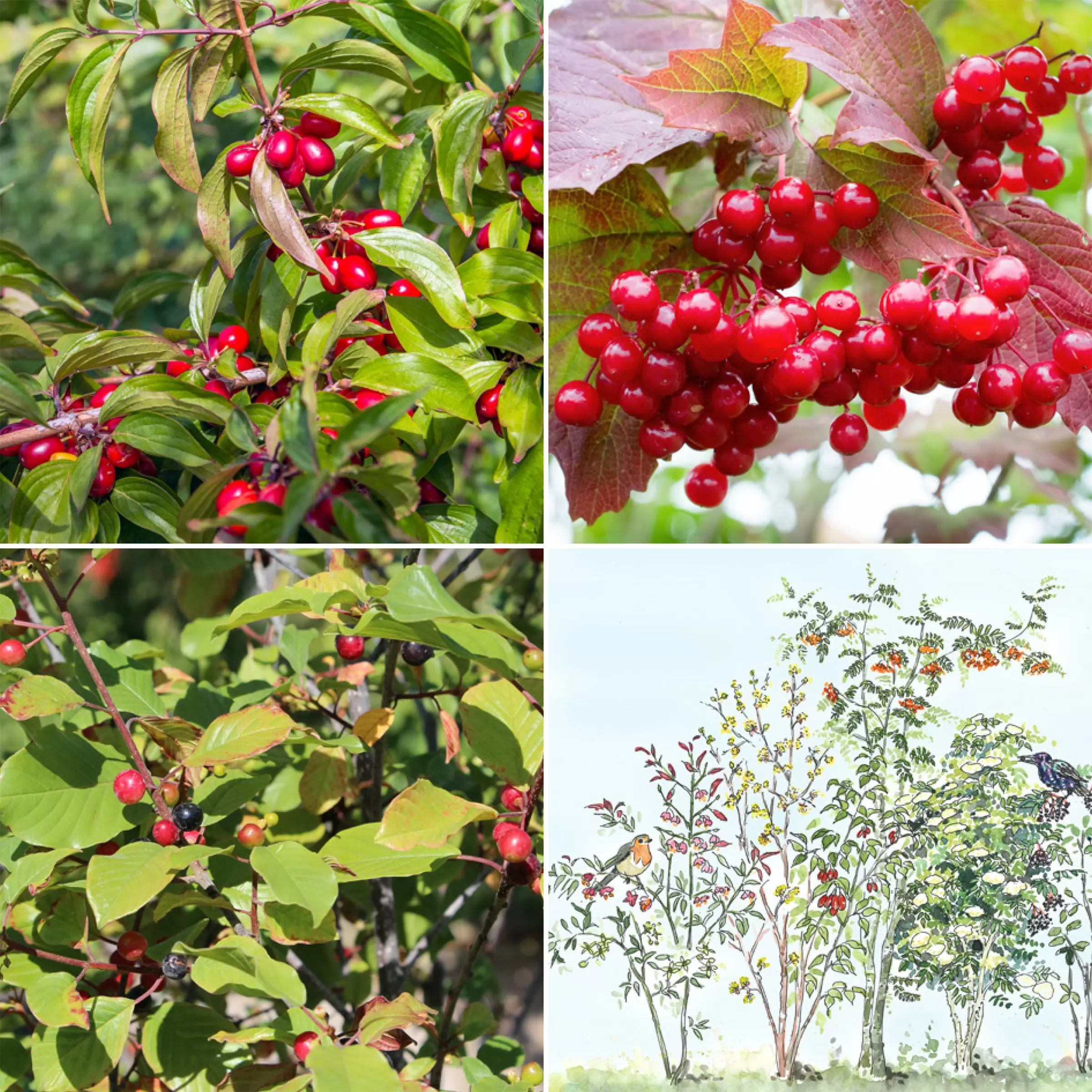 Mit dem Wildheckenset Vogelschmaus bieten Sie den Vögeln in Ihrem Garten ein reichhaltiges Nahrungsangebot. Die sechs einheimischen Gehölze sind bestens an unser Klima angepasst und sehr pflegeleicht. Es sind alles äusserst wertvolle Vogelnährgehölze, die unsere Artenvielfalt nachhaltig unterstützen und für rund 60 Vogelarten ein Nahrungsangebot bieten.