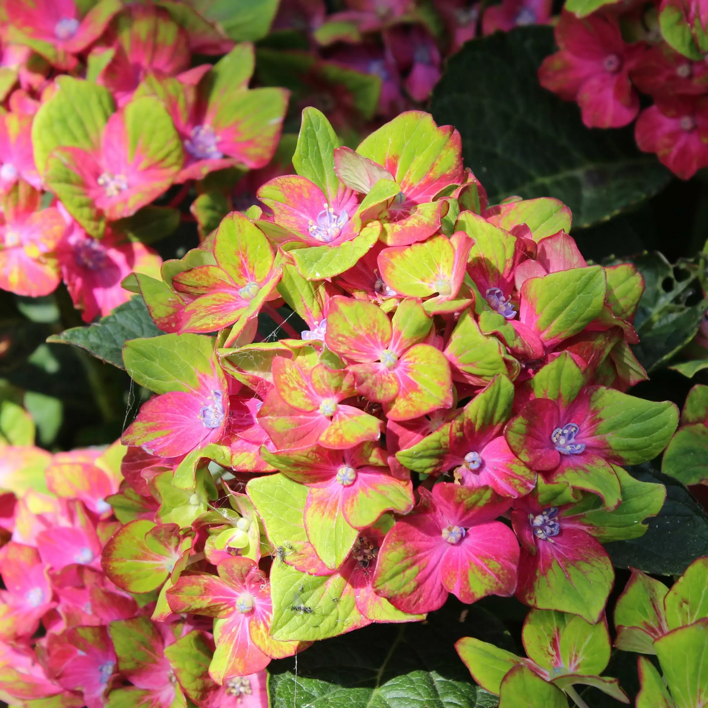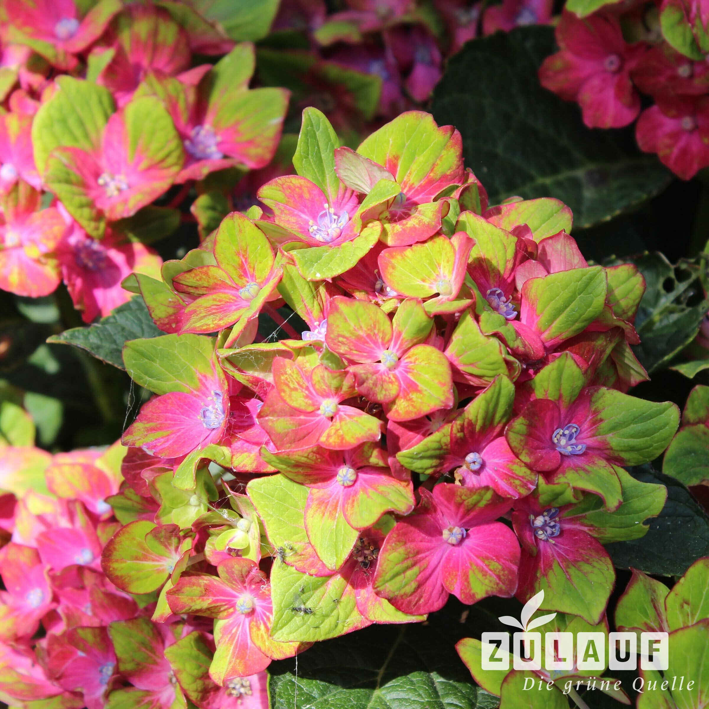 Die Ball-Hortensie (Hydrangea macrophylla 'Schloss Wackerbarth'®) hat überaus auffällige, rot-grün-blaue Blüten.