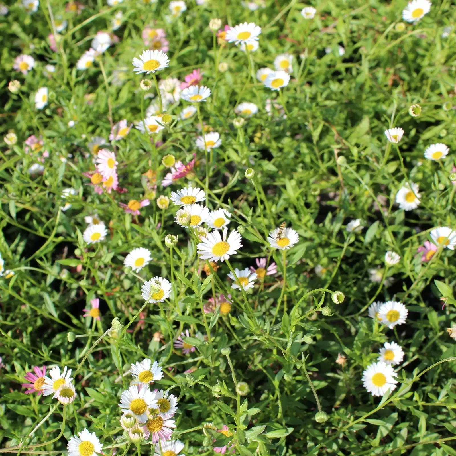 Das blühfreudige Berufskraut (Erigeron karvinskianus) ist auch unter den Namen Karwinskis Feinstrahl, Spanisches Gänseblümchen oder Mexikanisches Berufkraut bekannt. Die Staude ist eine hervorragende Bienenweide, denn ihre lange Blütezeit von Juni bis Oktober macht sie überaus wertvoll.