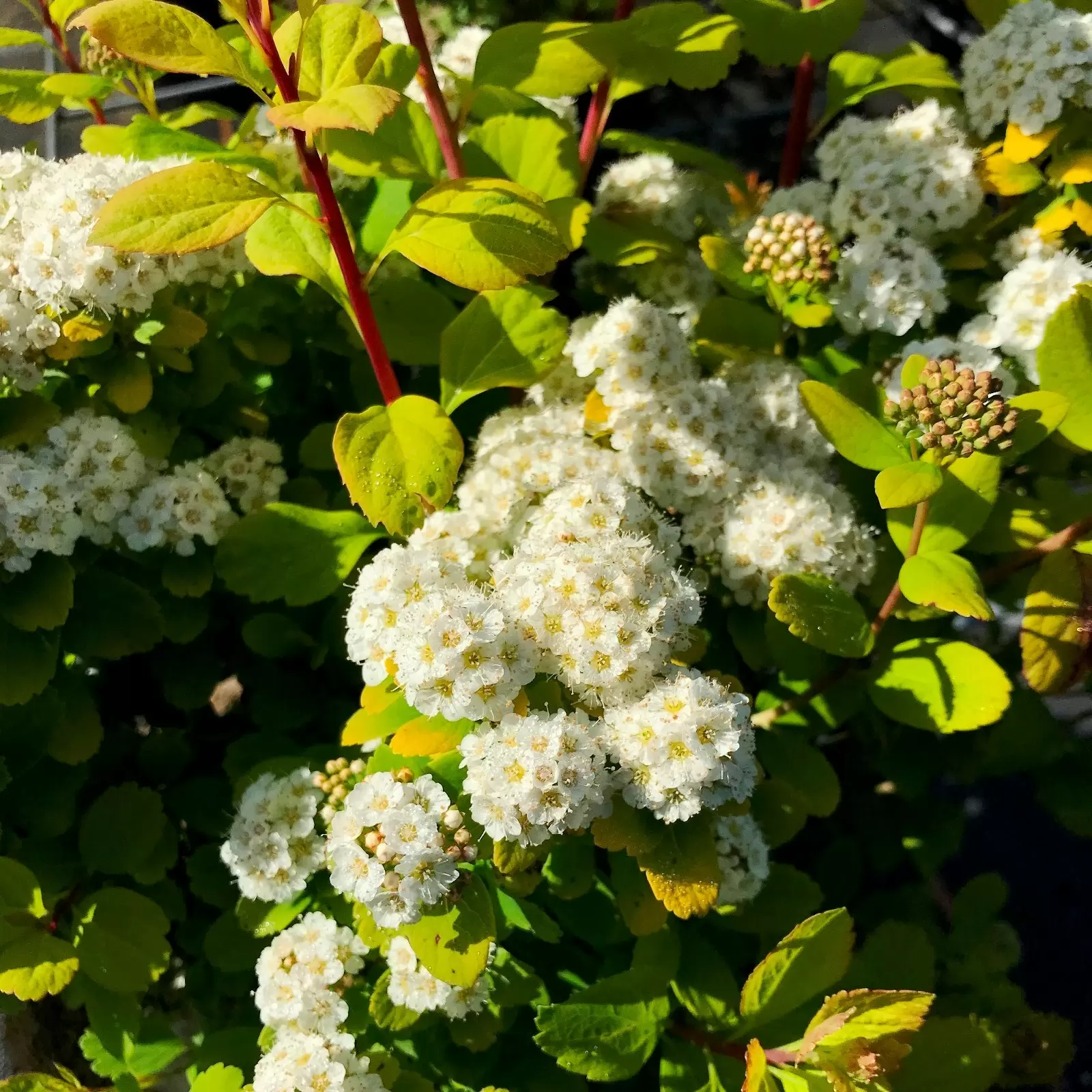 Der Birkenblättrige Spierstrauch (Spiraea betulifolia 'Tor Gold') wird nur etwa 80 cm hoch, überzeugt mit schönen Blüten, goldgelben Blättern und grandioser Herbstfärbung.