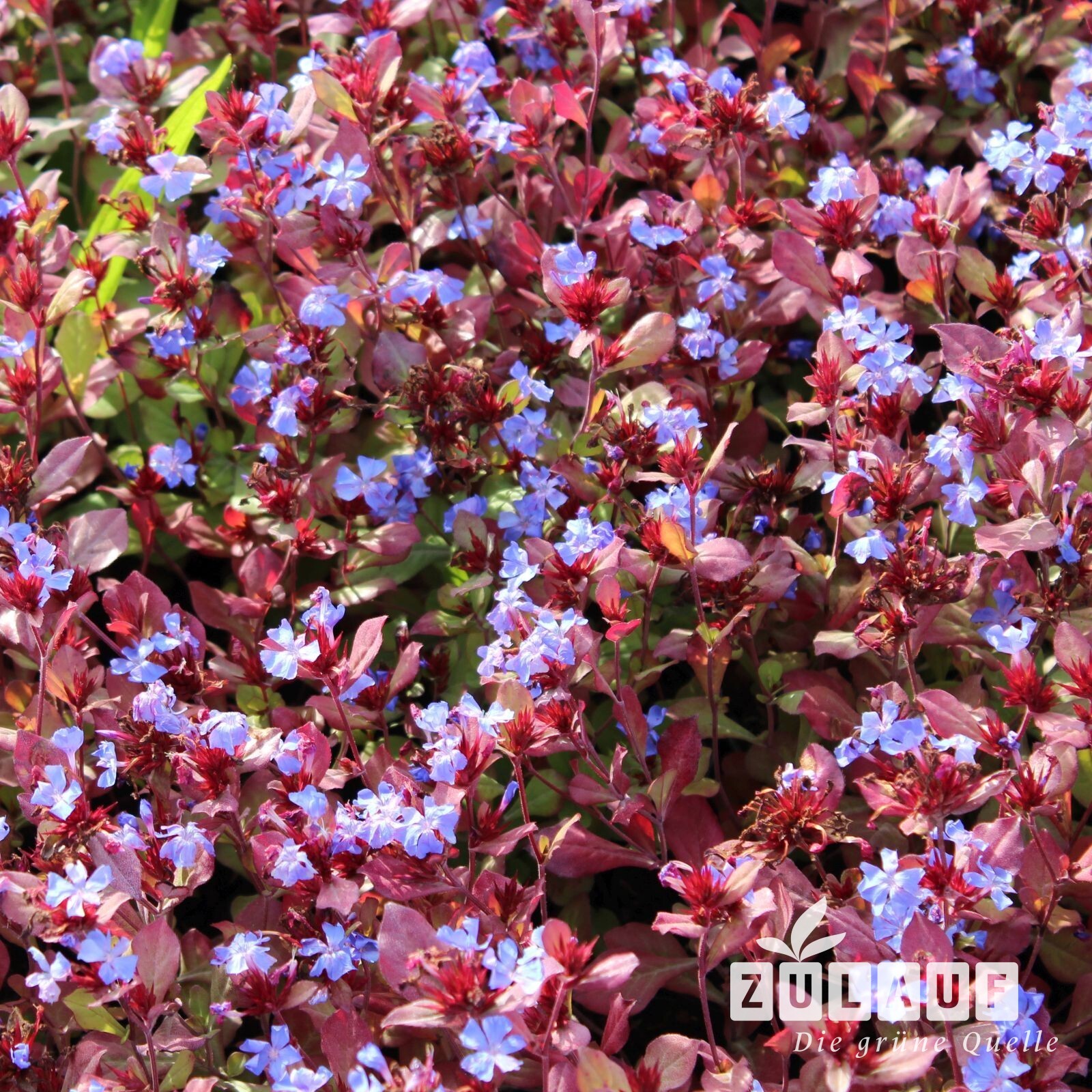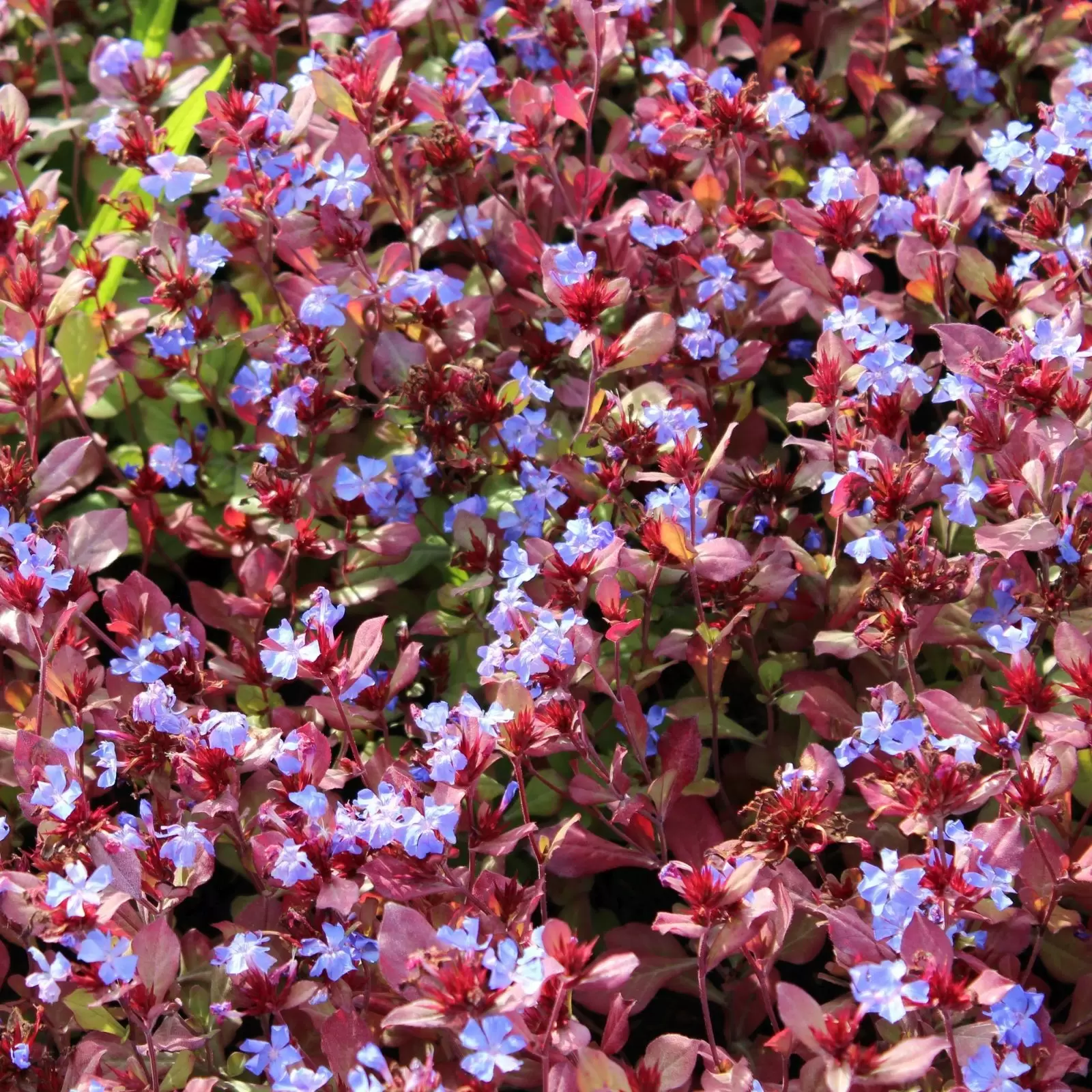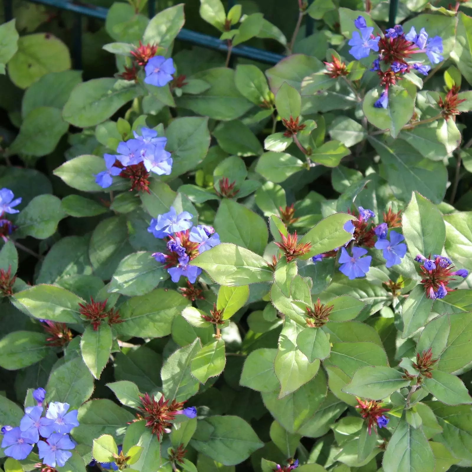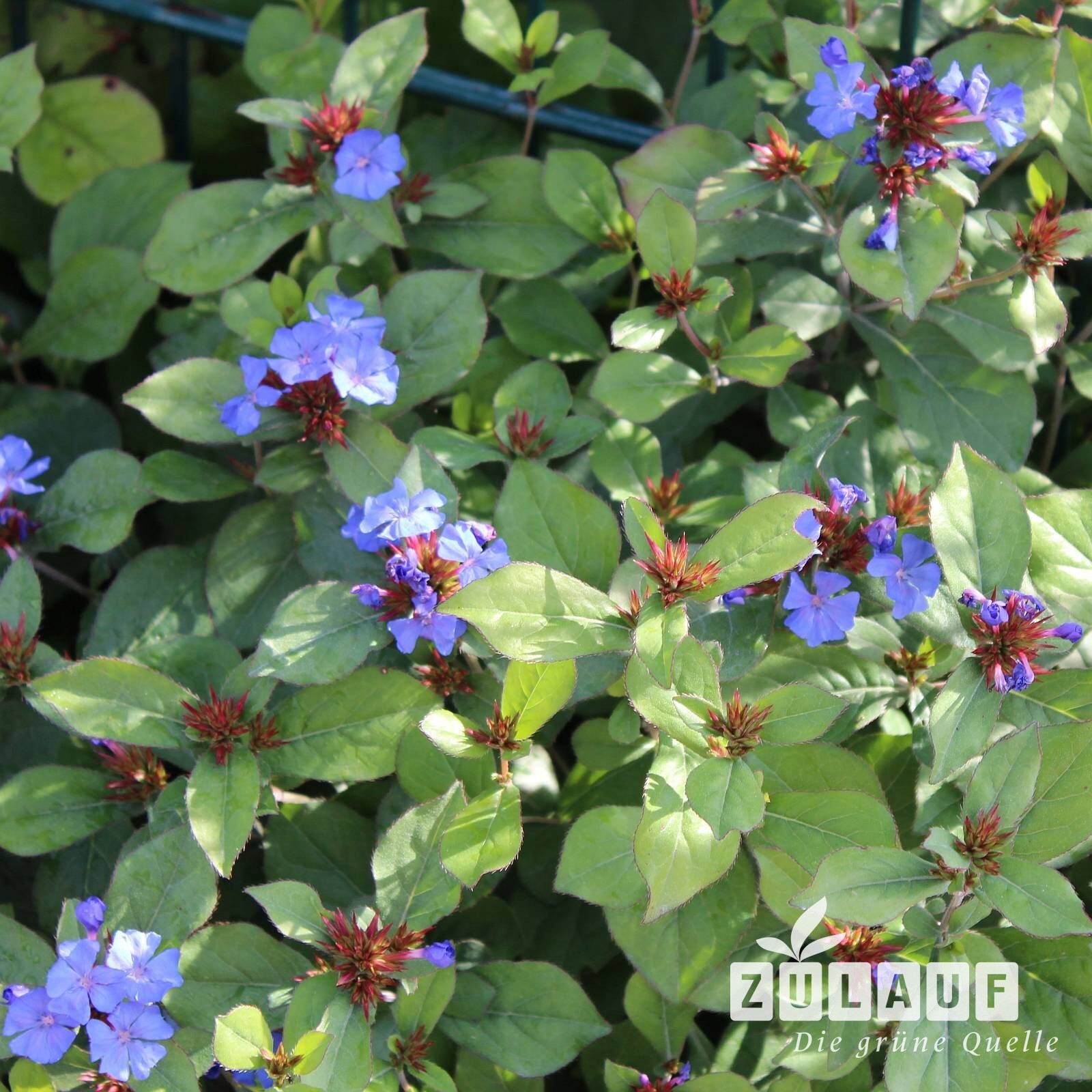 Der Bleifuss (Ceratostigma willmottianum) wird auch Hornnarbe genannt und ist ein äusserst dankbarer Kleinstrauch mit zahlreichen Blüten und feuerroter Herbstfärbung.