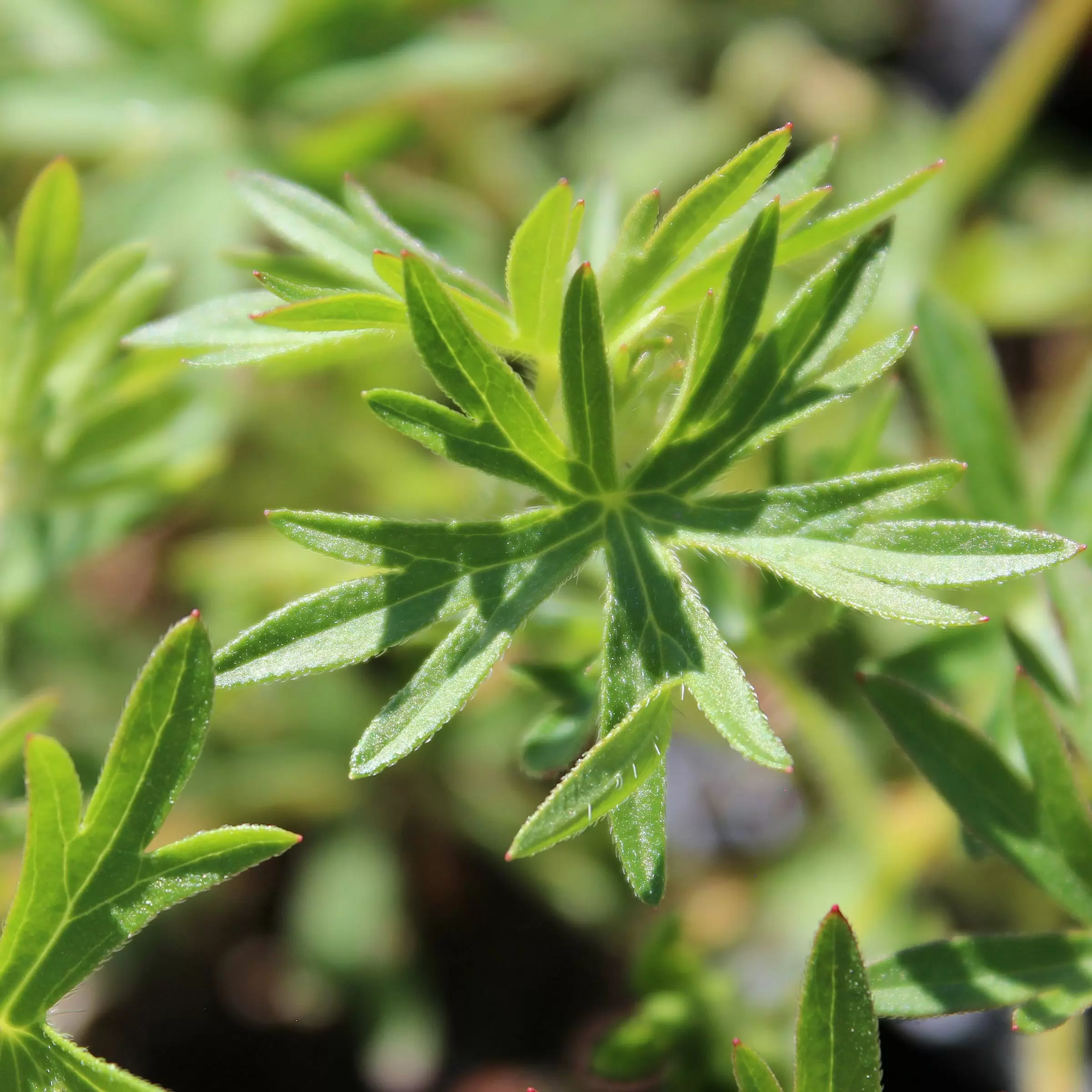 - Dunkelgrüne, tief eingeschnitten, handförmige Blätter. Herbstfärbung orange- bis blutrot.