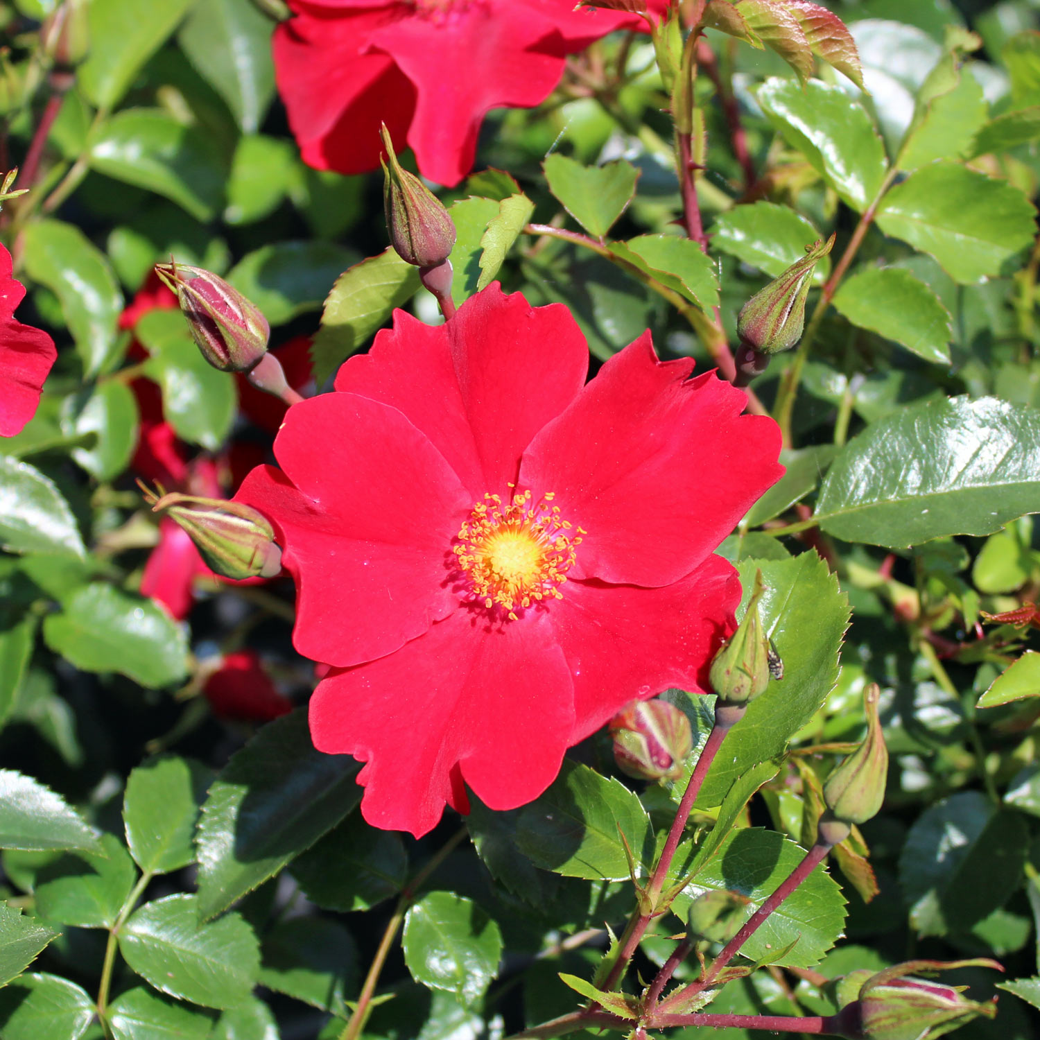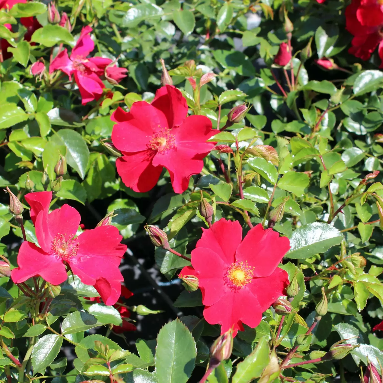 - Das Farbenspiel aus roten Blütenblättern und dunkelgrünem Laub sorgt für einen tollen Anblick. Die Blattgesundheit ist vorzüglich.
