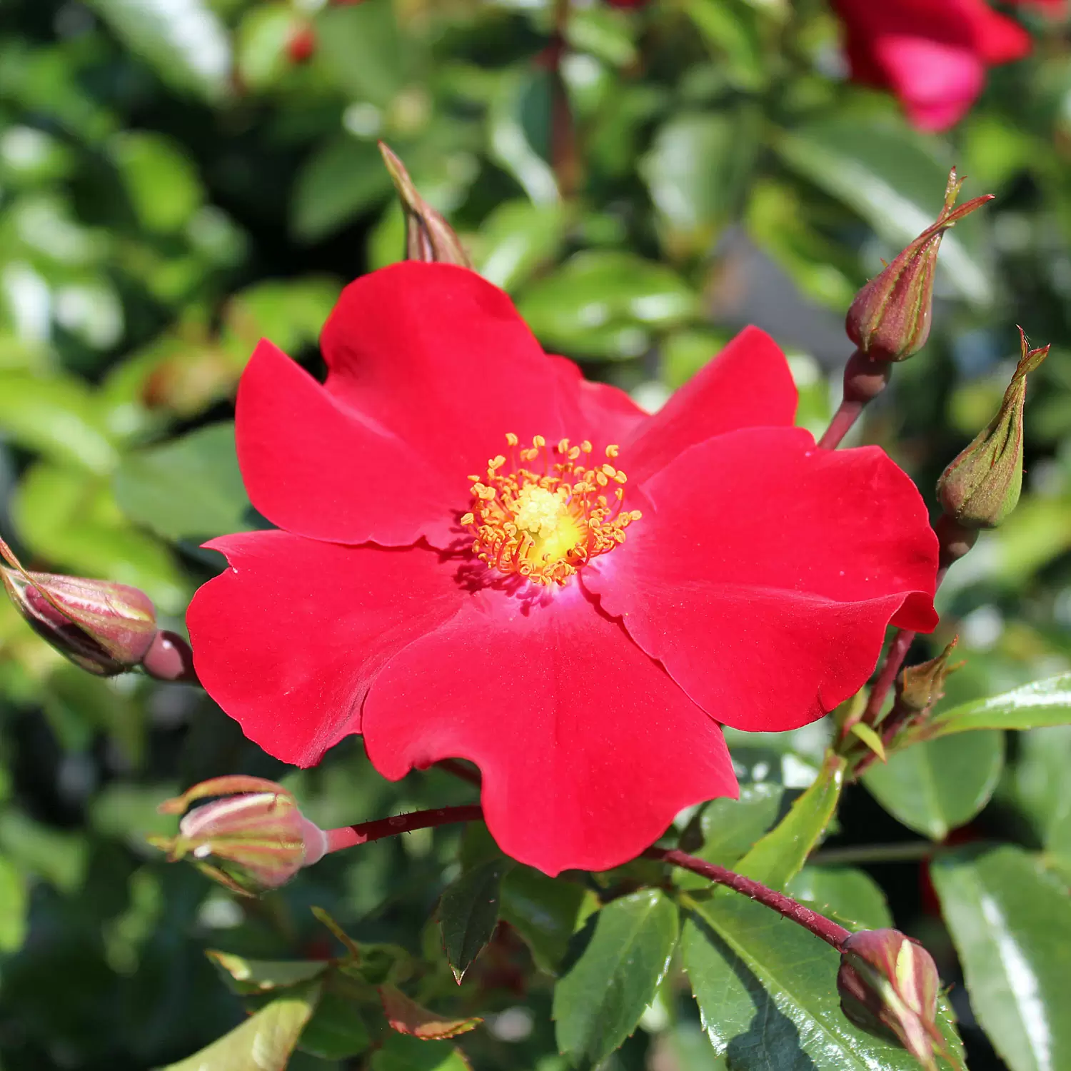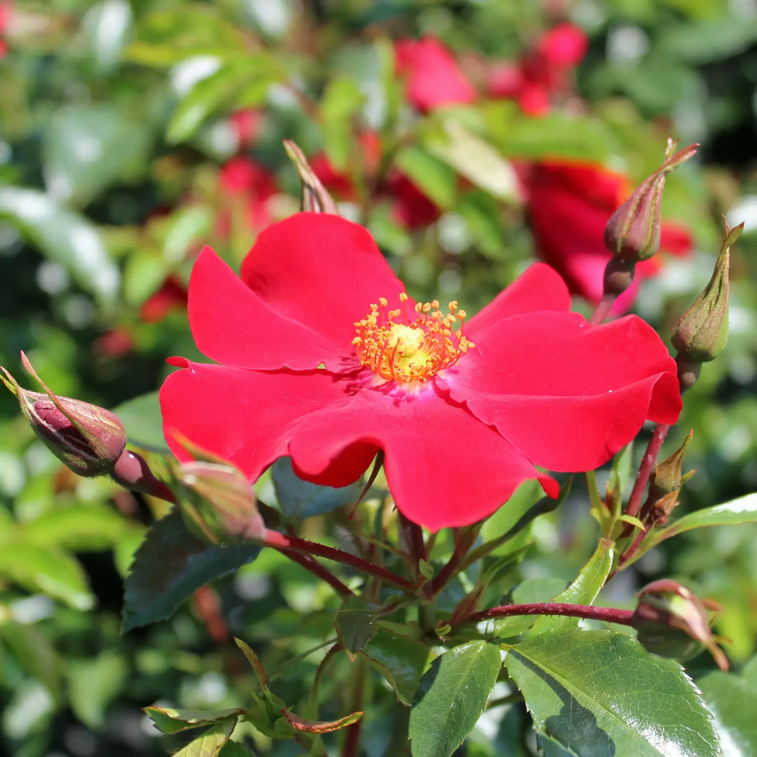 - Die leuchtend roten, halbgefüllten Blüten duften leicht und besitzen intensiv gelbe Staubgefässe. Sie versorgen Bienen und andere Insekten bis in den Herbst hinein mit Nektar.