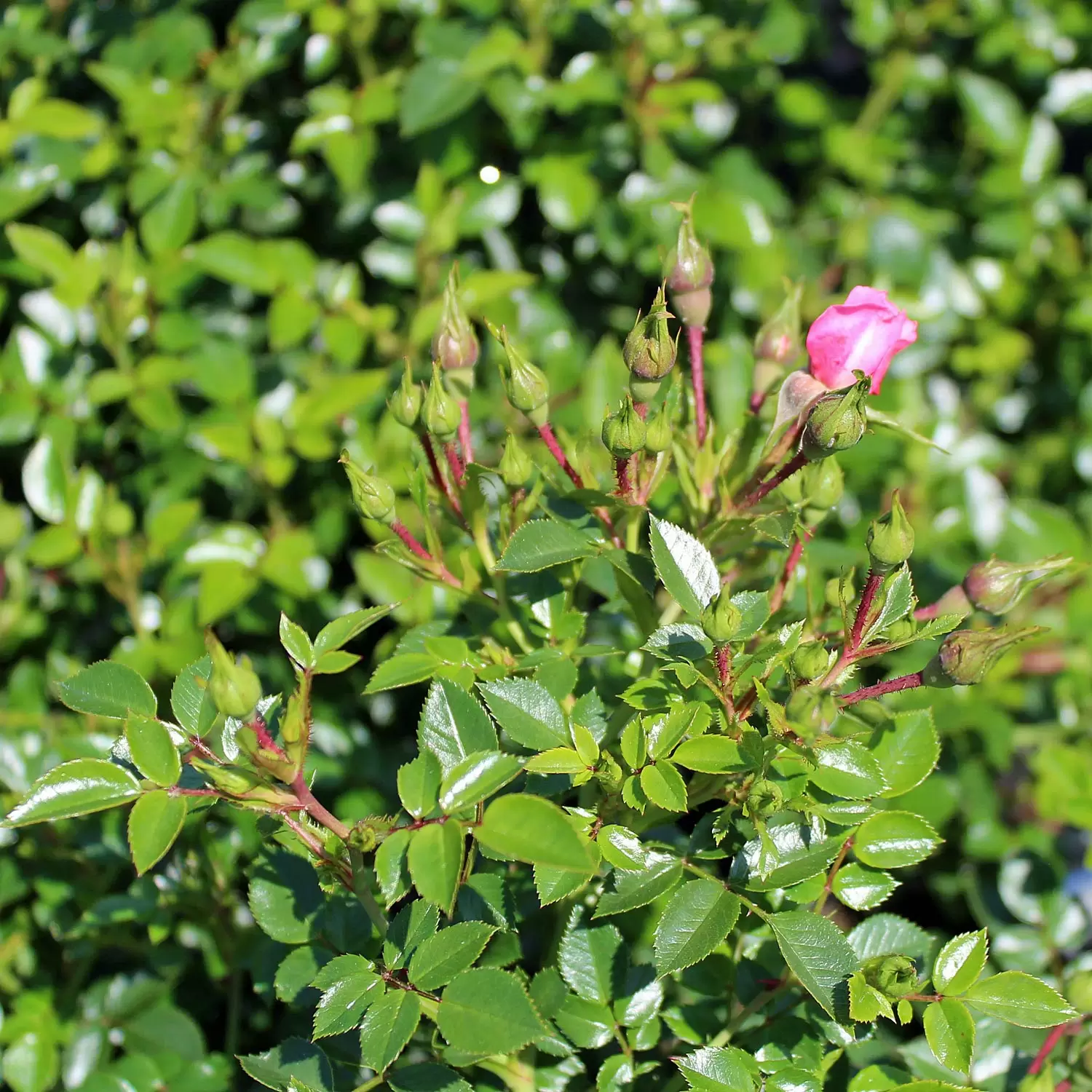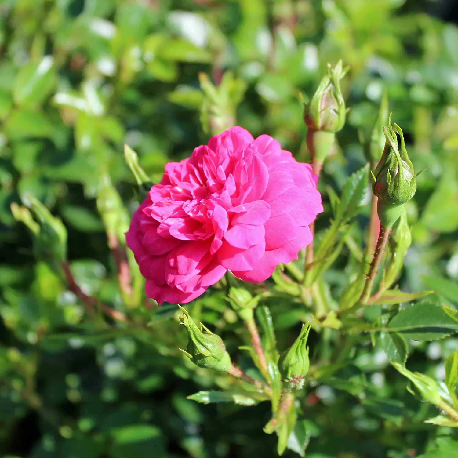 Die Bodendecker-Rose 'Knirps' (Rosa (BD) 'Knirps'®) bildet kleine, gefüllte, dunkelrosa schimmernde Blüten, die einen wunderschönen Blütenteppich bilden. Aufgrund ihrer niederliegenden Wuchsform eignet sie sich für Böschungen, Rabatten und grössere Flächen.