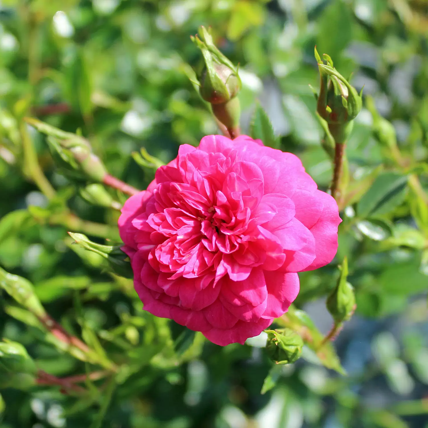 - Die stark gefüllten, kleinblumigen und öfterblühenden Blüten schimmern in einem kräftigen Rosa. Sie haben orangefarbene Staubgefässe und nur wenig Duft. Von Juli bis Oktober blühen sie in dichten Blütendolden.