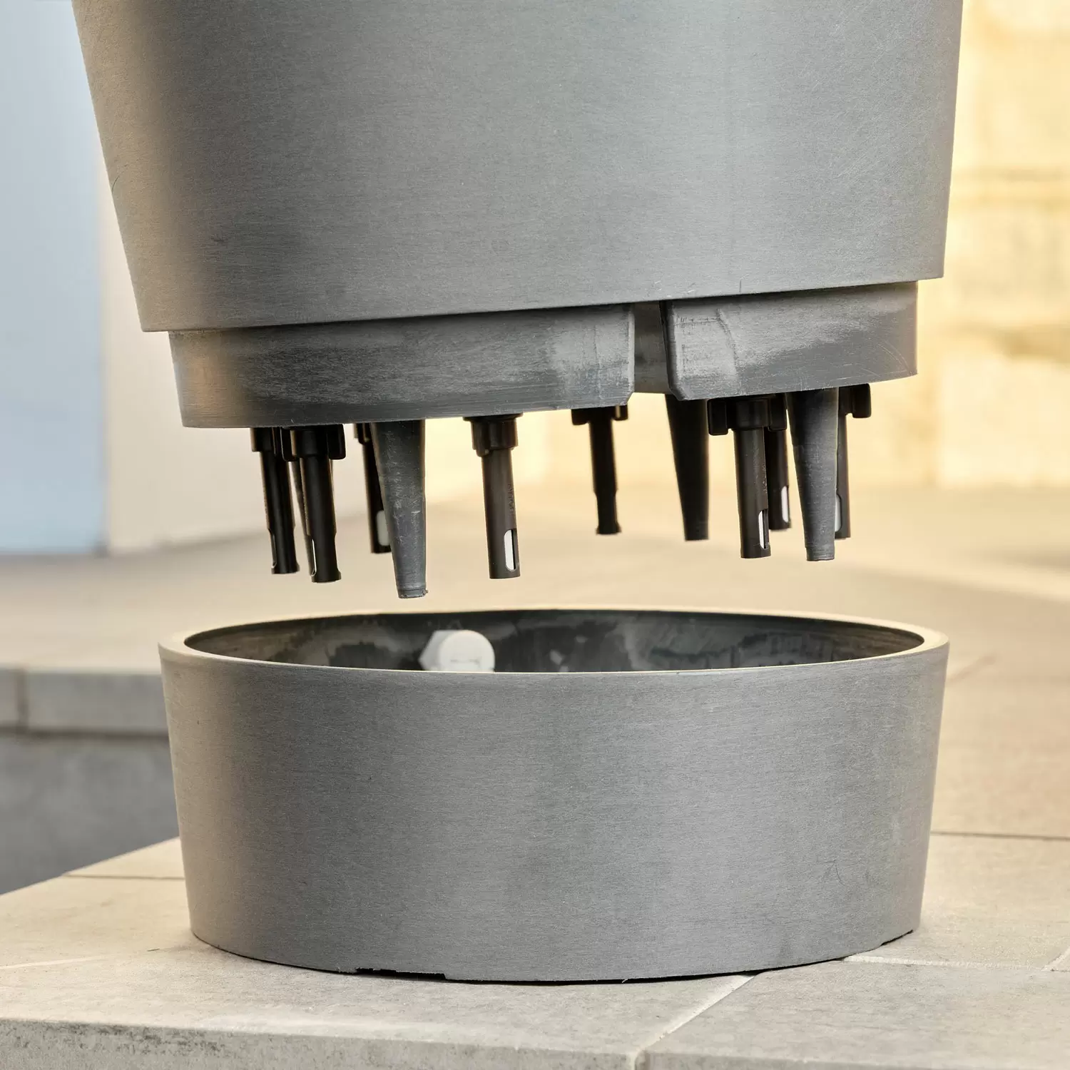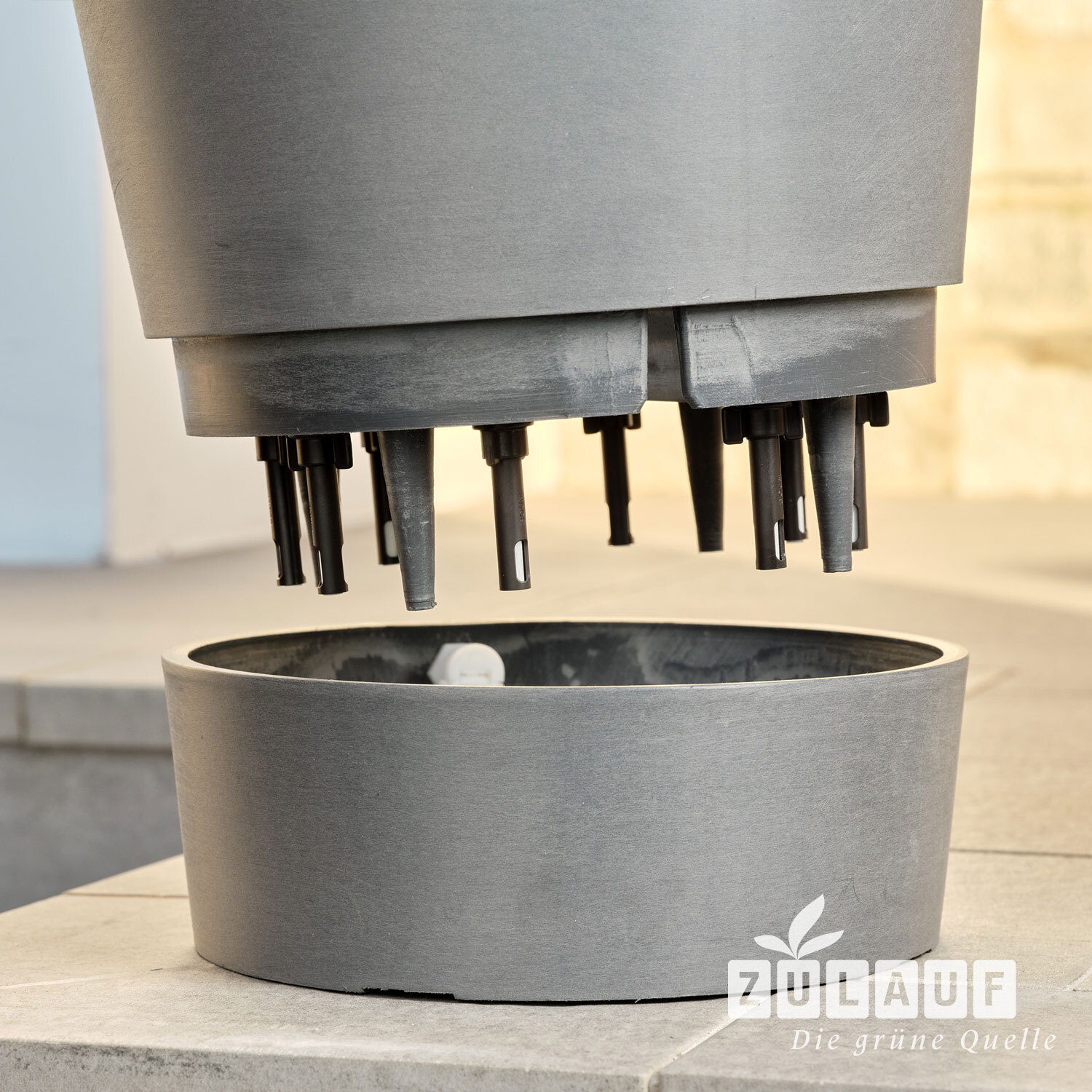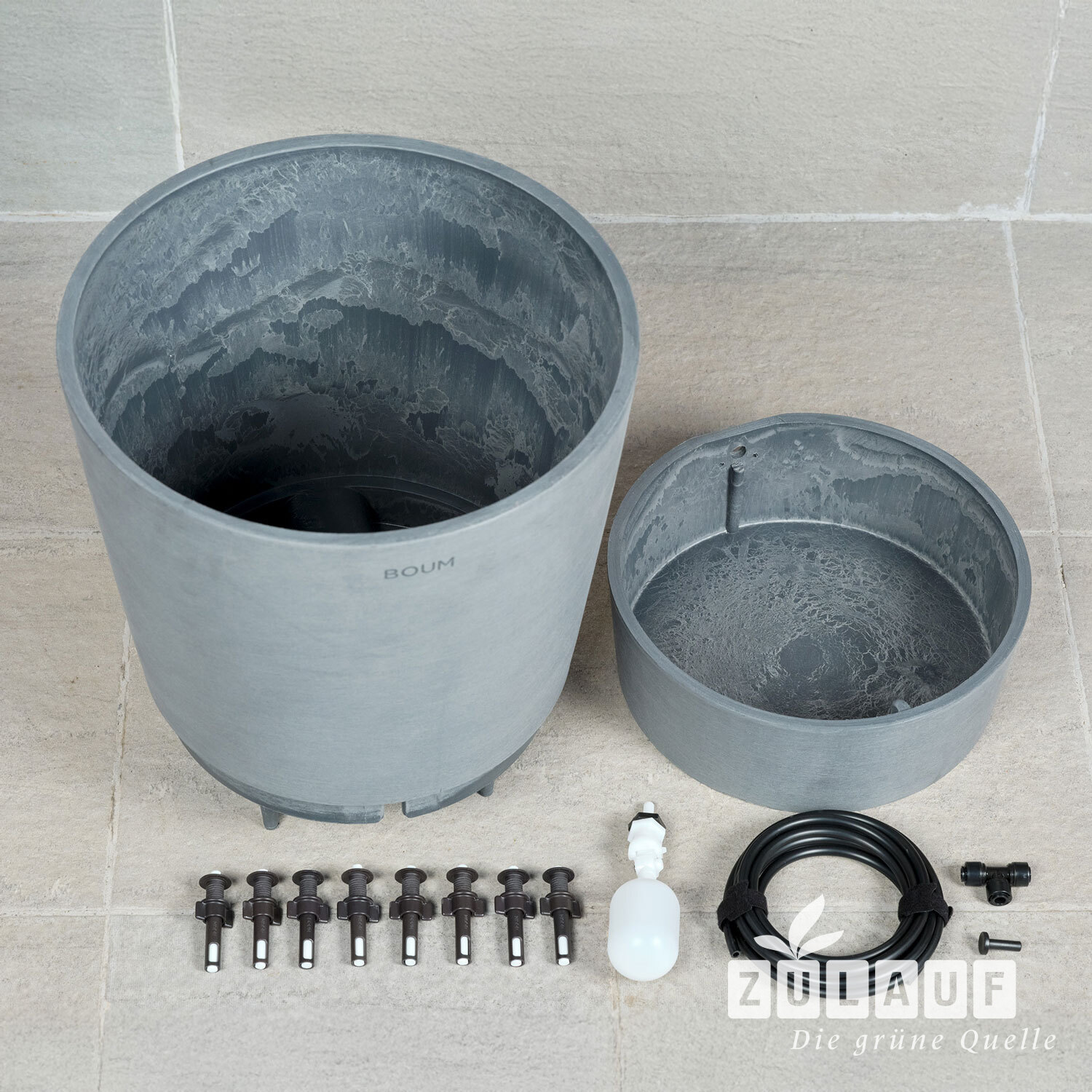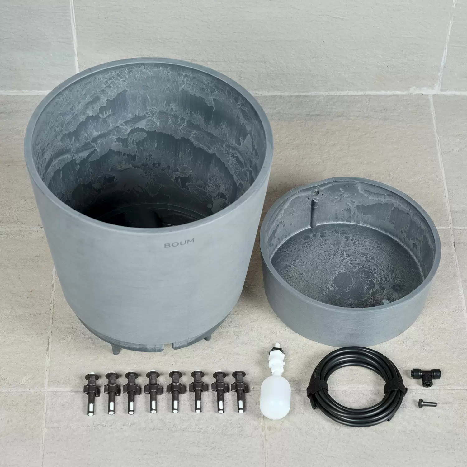 Kapillardochte ziehen Wasser aus dem integrierten Reservoir des Topfs und sorgen so für optimale Bodenfeuchte. Ein Schwimmerventil reguliert die Wasserzufuhr zum Reservoir. Durch eine dezente, einfach zu installierende Verschlauchung wird der Topf mit der Boum Bewässerung verbunden. Damit werden Pflanzen mehrere Wochen zuverlässig mit Wasser versorgt. Der Topf besteht aus hochwertigem, 80% recyceltem Mineral-Kunststoffgemisch mit Handfinish. Er ist dekorativ, stoss- und bruchfest, leicht zu bewegen, UV- und frostresistent.