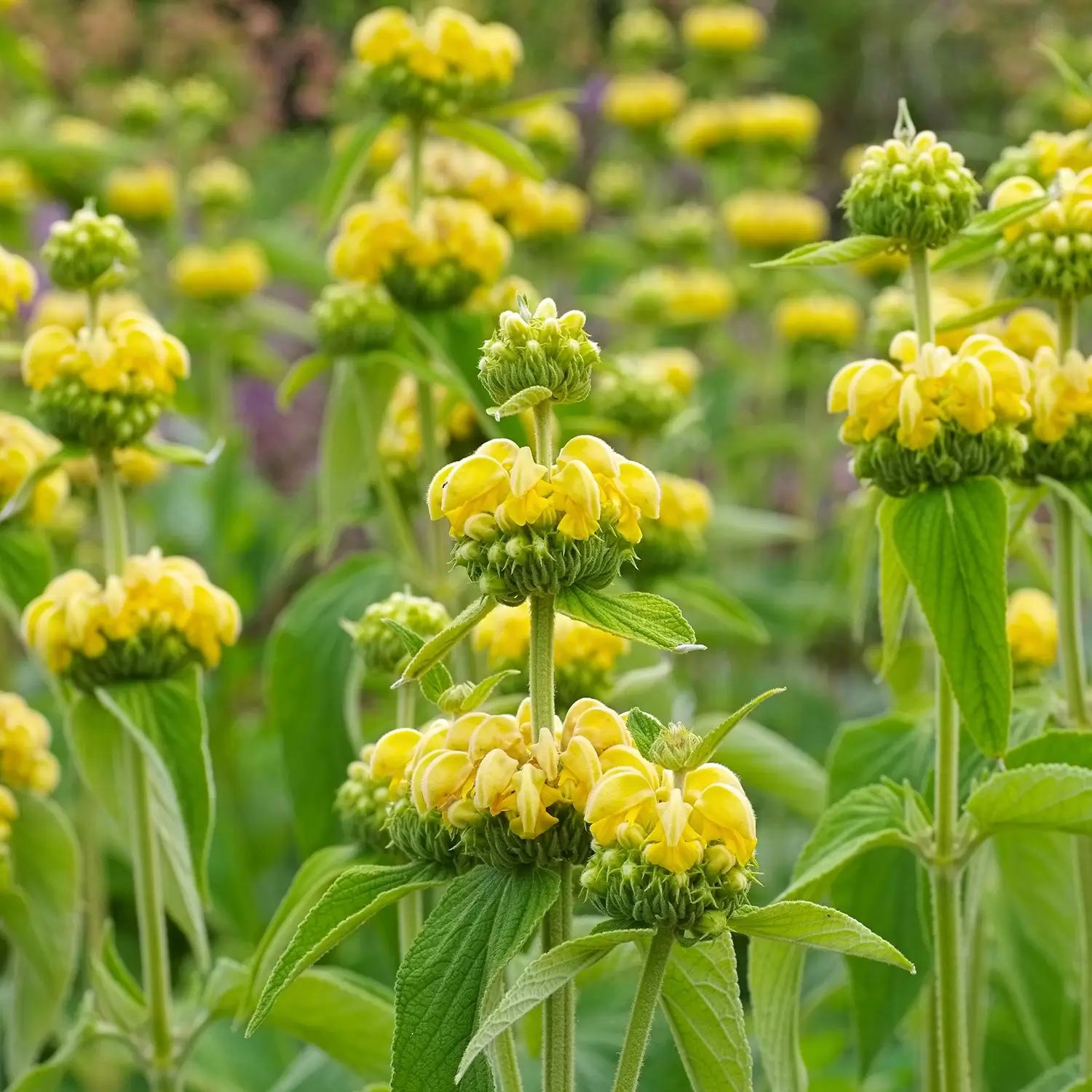 - Gelbe Lippenblüten, die etagenartig rund um den Stängel angeordnet sind.