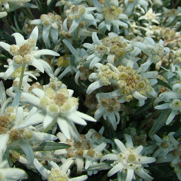 - Silber-weisse kleine Sternblüten, umgeben von dicken wolligen Hochblättern.