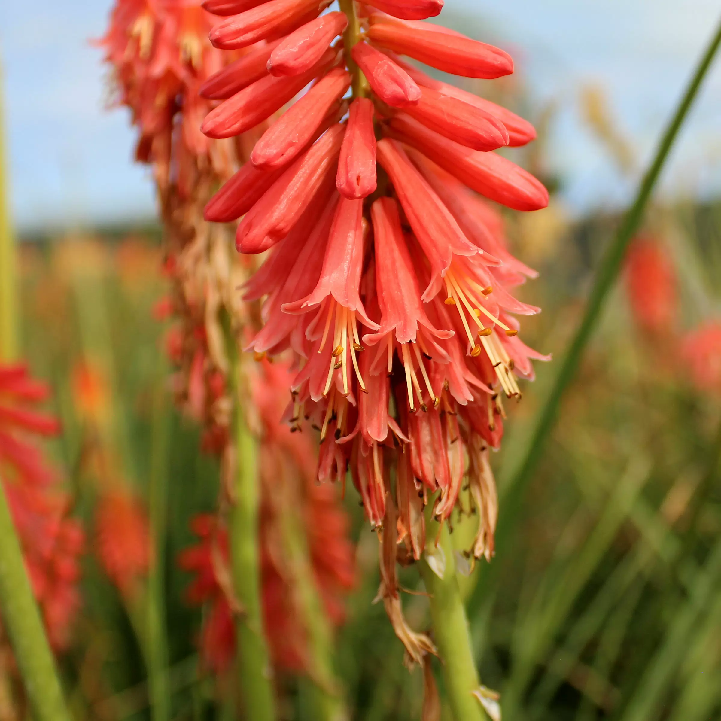 Röhrenförmige feuerrote Einzelblüten, die zu prachtvollen Blütenkolben angeordnet sind.