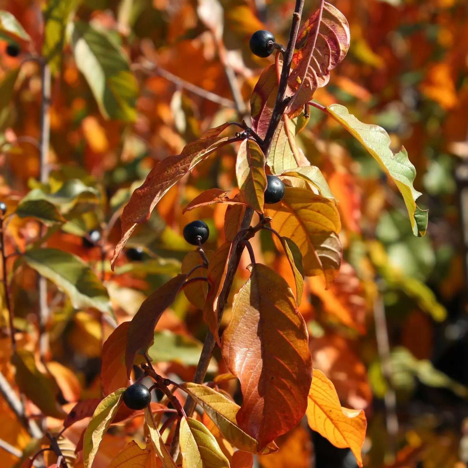 Der einheimische Faulbaum (Frangula alnus) überzeugt im Herbst mit seinen roten, später schwarzen Beeren und seiner gelborangen Herbstfärbung. Die Beeren sind leicht giftig und die Rinde riecht etwas faulig.