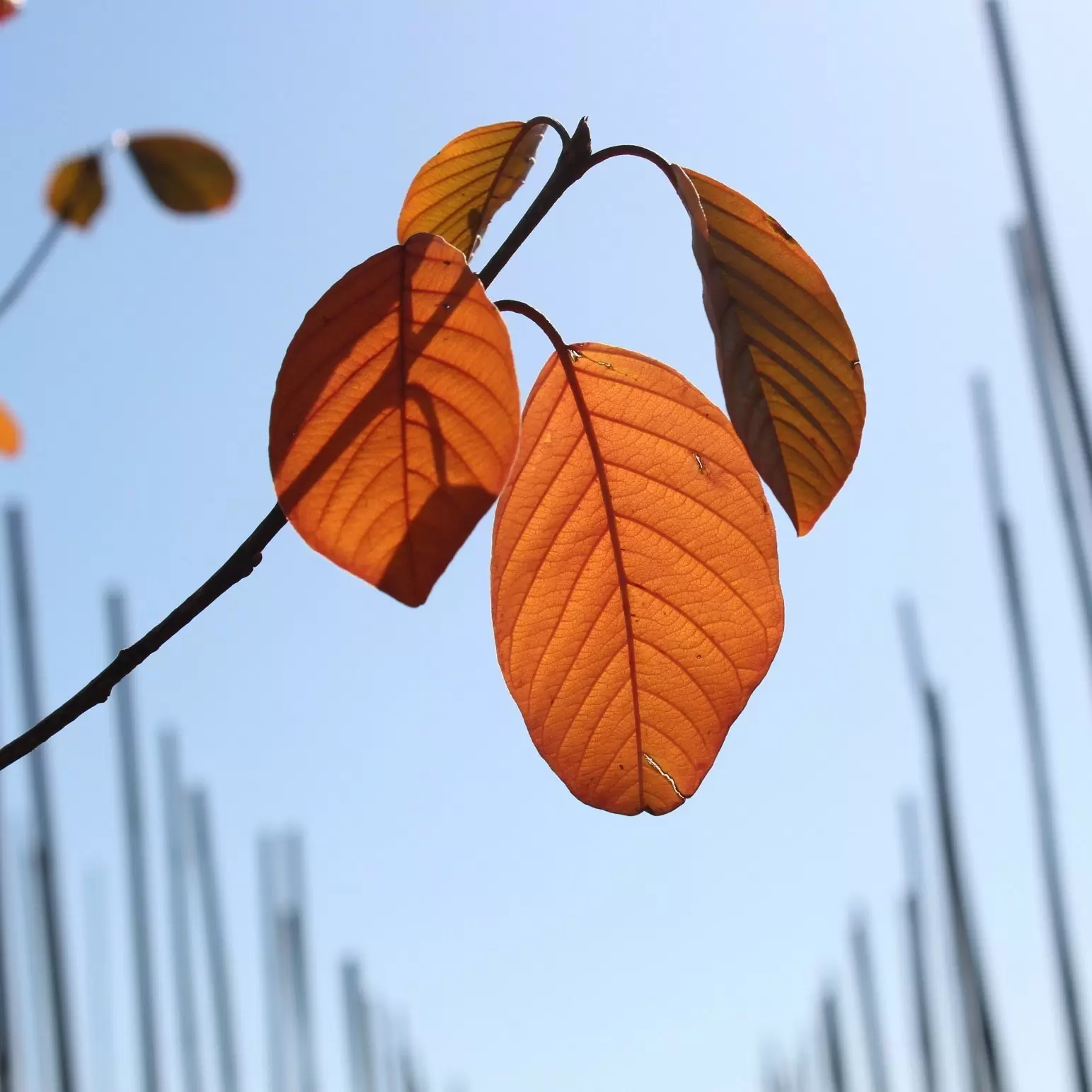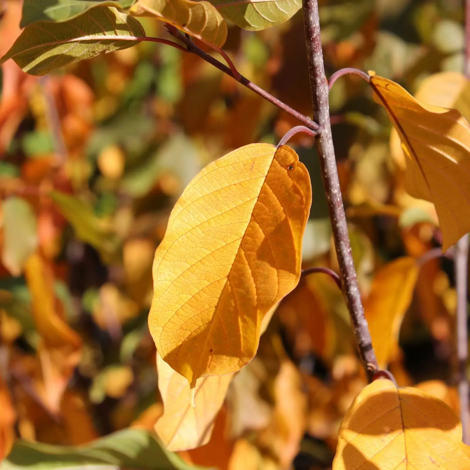 - Grüne, breit eiförmige Blätter mit deutlich sichtbaren Blattadern und einer schönen, meist gelben Herbstfärbung.