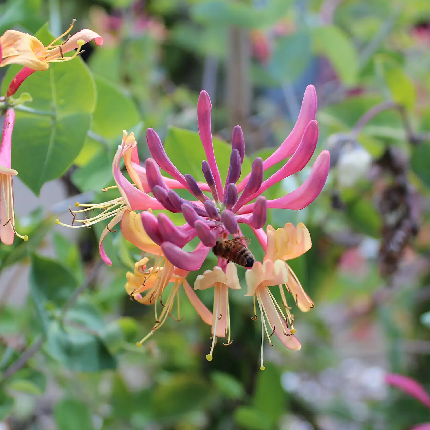 Das Feuer-Geissblatt 'Goldflame' (Lonicera x heckrottii 'Goldflame') ist aufgrund seiner schönen, gelbroten Blüten auch als Gelbrotes Geissblatt bekannt. Diese blühfreudige Kletterpflanze hat duftende Blüten, die viele Insekten anlocken.