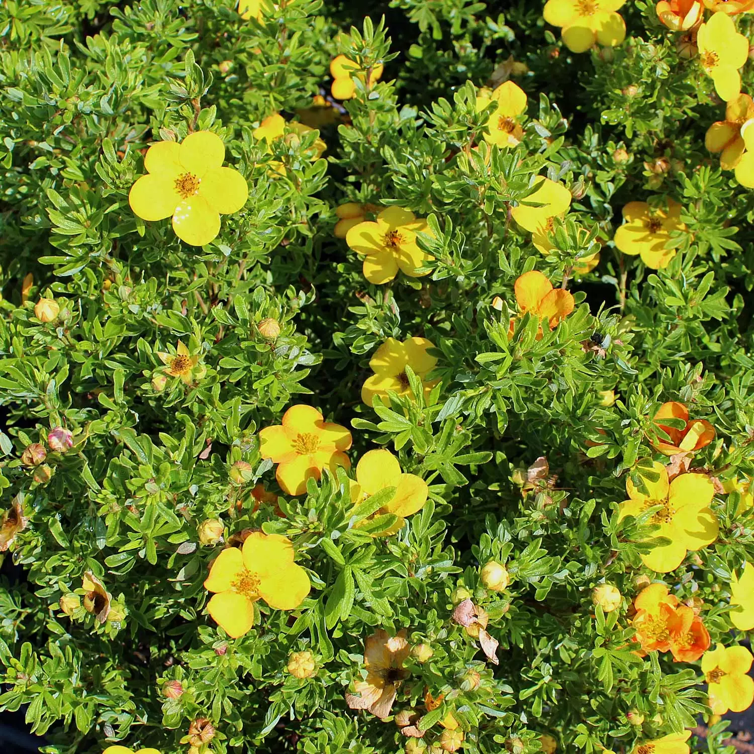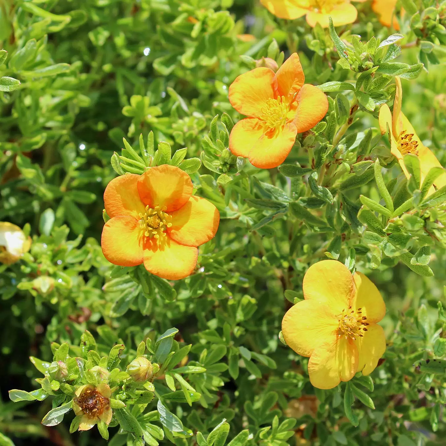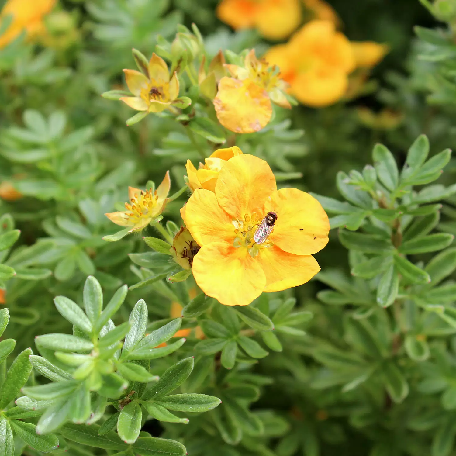 Der Fingerstrauch (Potentilla fruticosa 'Mango Tango') blüht von Mai bis Oktober mit orangen Blüten. Er ist pflegeleicht und verträgt auch trockene Perioden und Hitze.