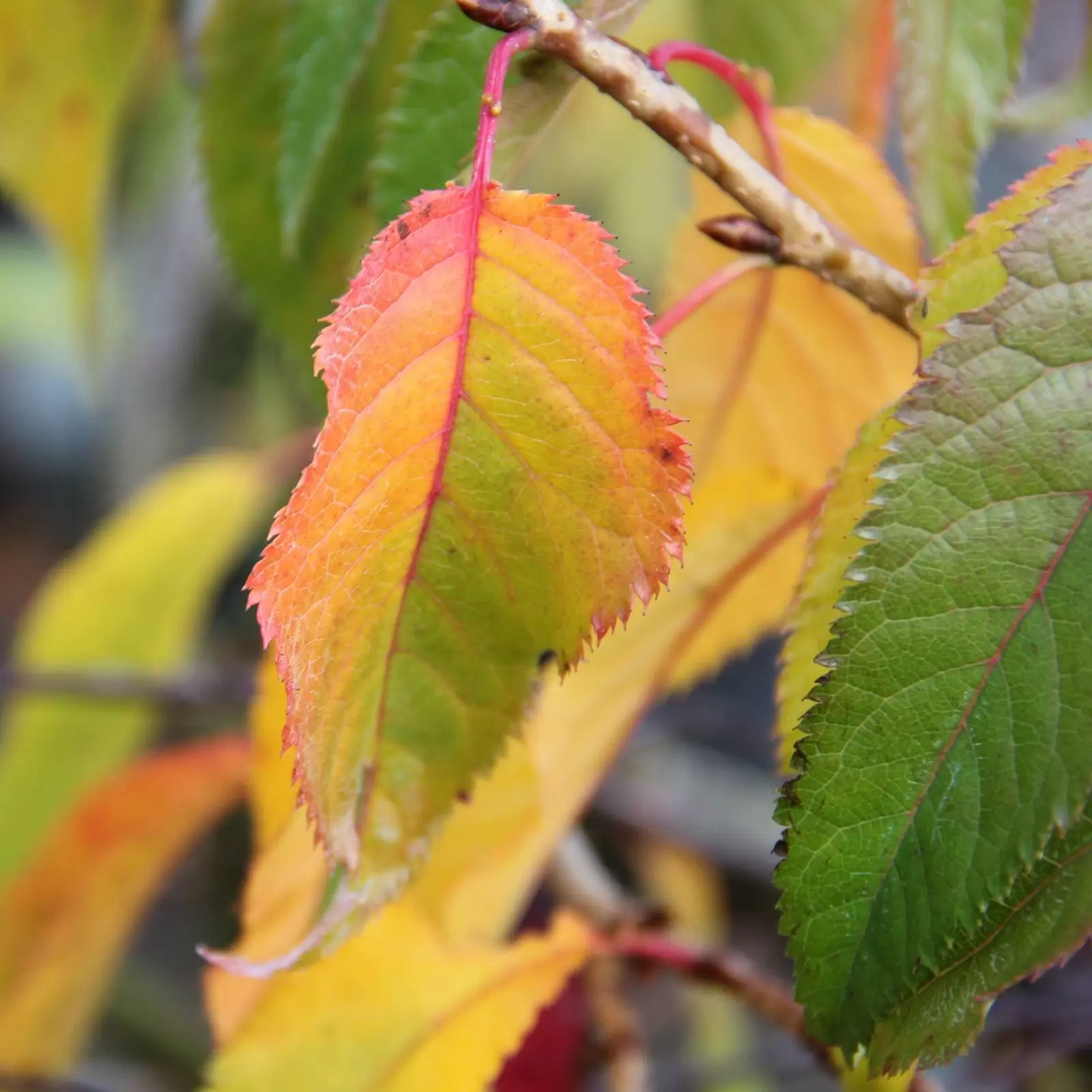 - Glänzend grüne, verkehrt eiförmige Blätter, Herbstfärbung gelb.