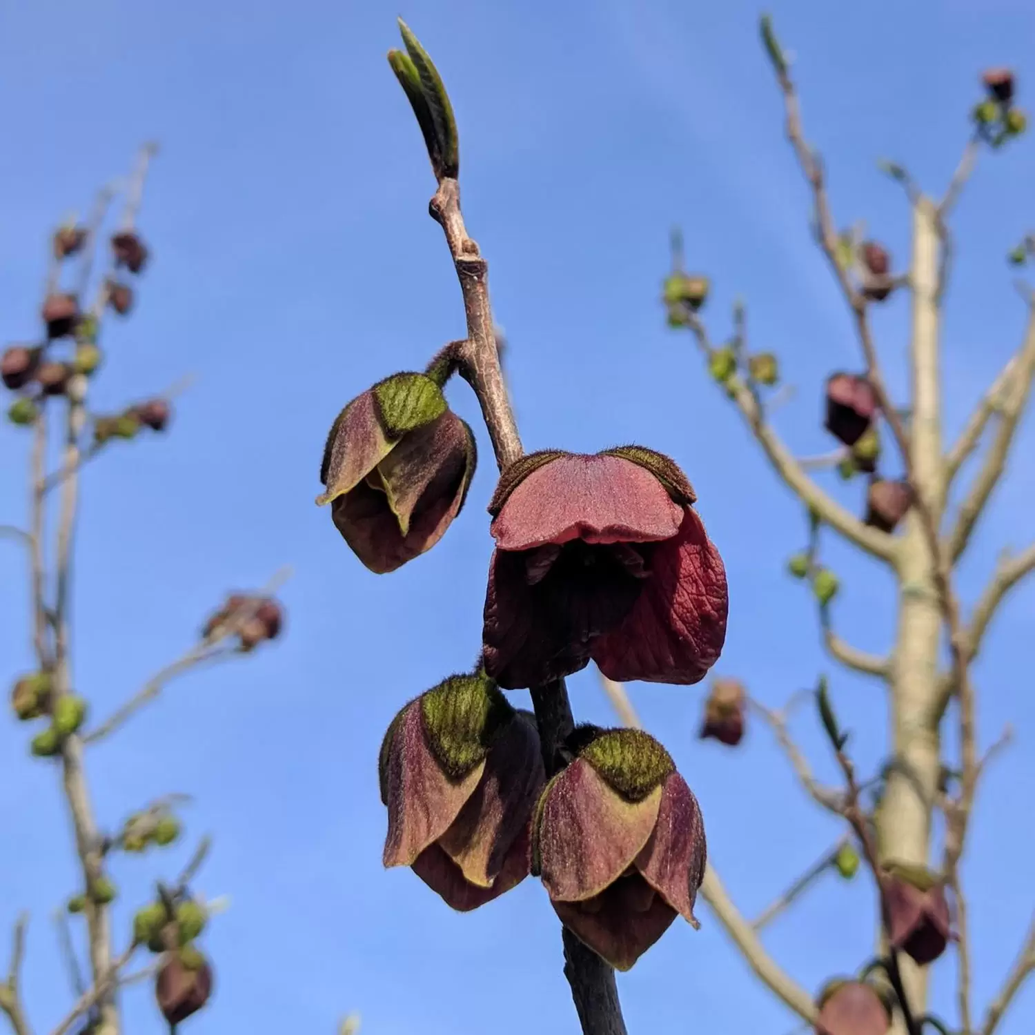 - Im April erscheinen eher kleine, glockenförmige, braunrote Blüten, die einen Durchmesser von 2 bis 4 cm haben.
