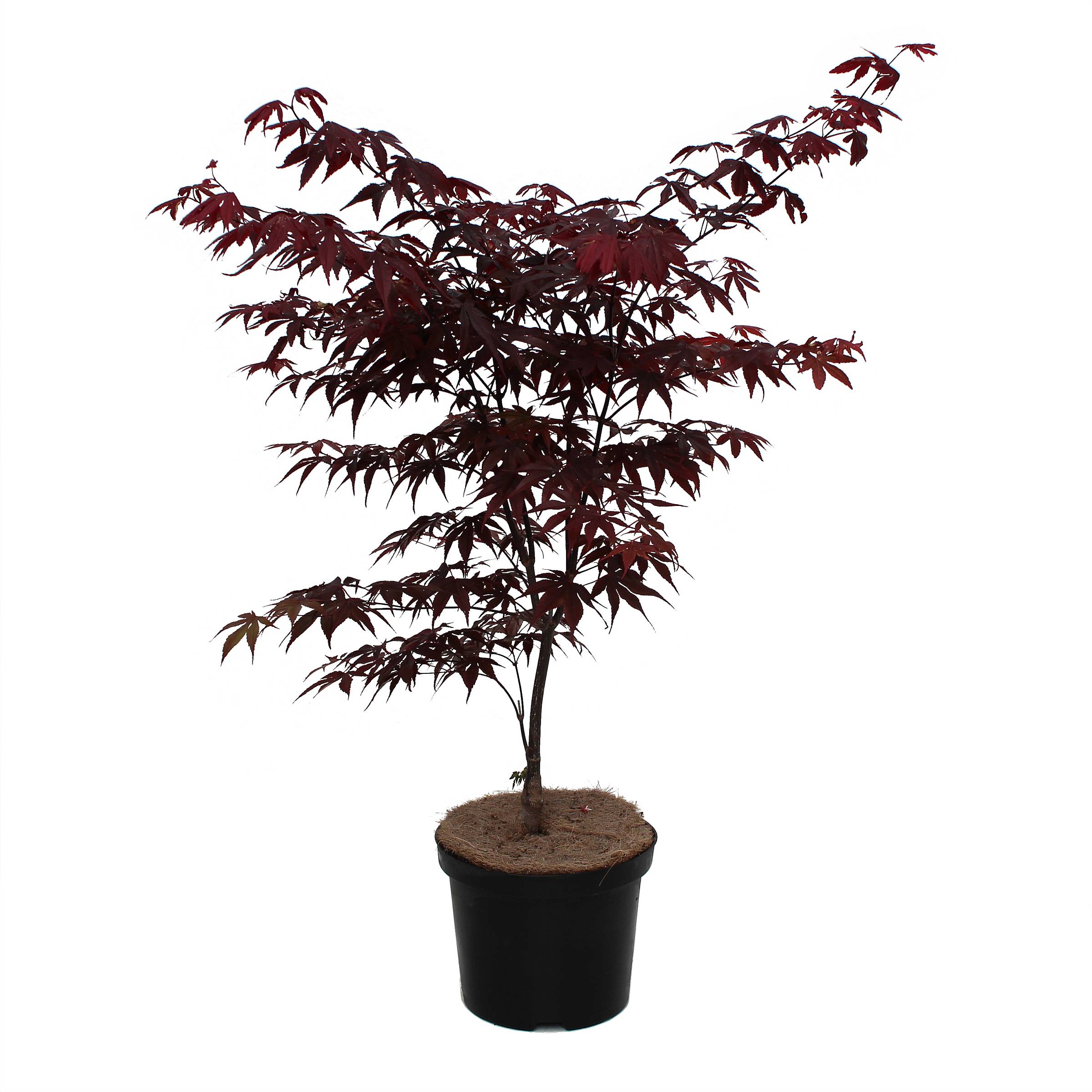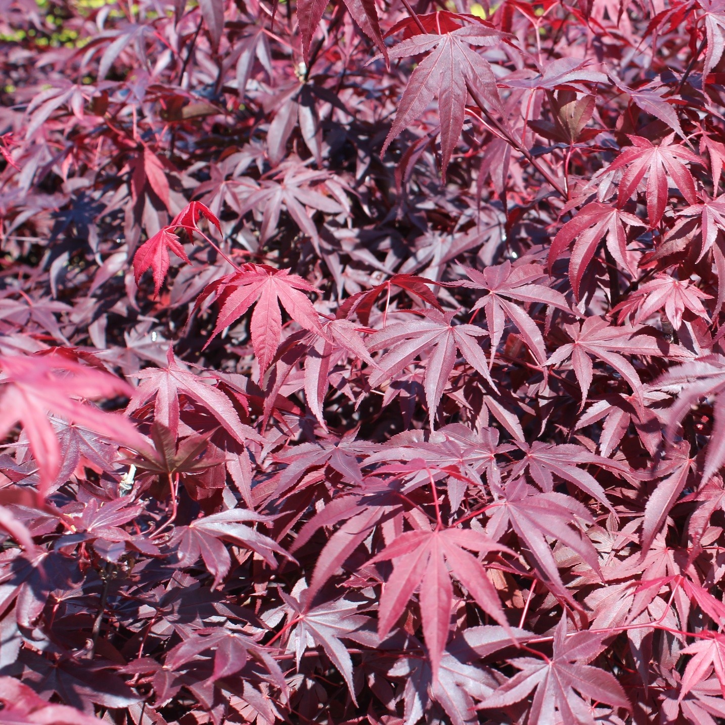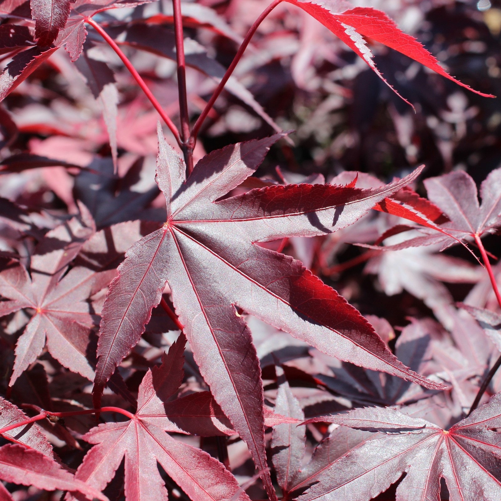 Das einmalige Farbenspiel der roten, sternförmigen Blätter machen den Japanischen Fächer-Ahorn (Acer palmatum 'Bloodgood') zu etwas ganz Besonderem. Er wächst baumartig und bildet oft mehrere Stämme.