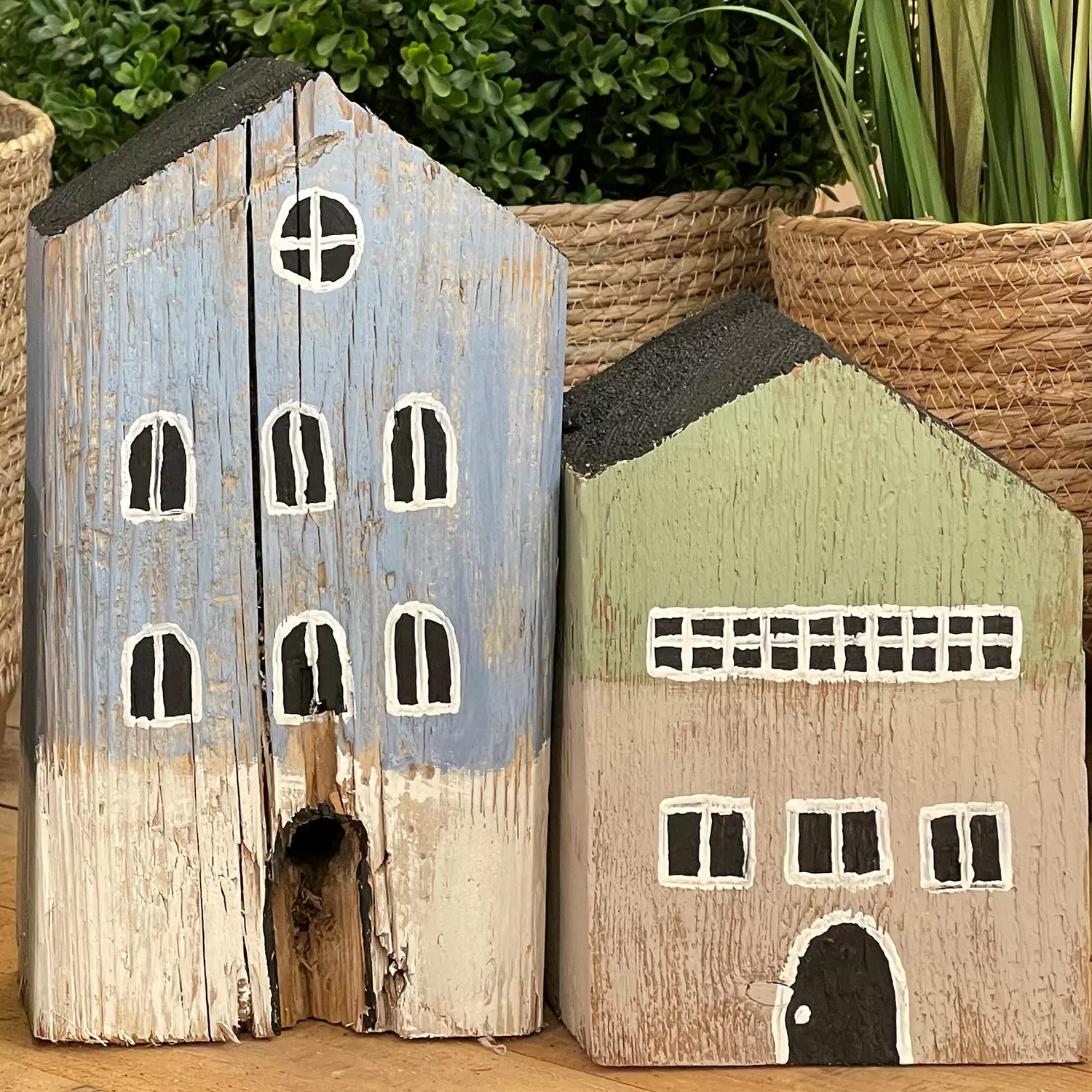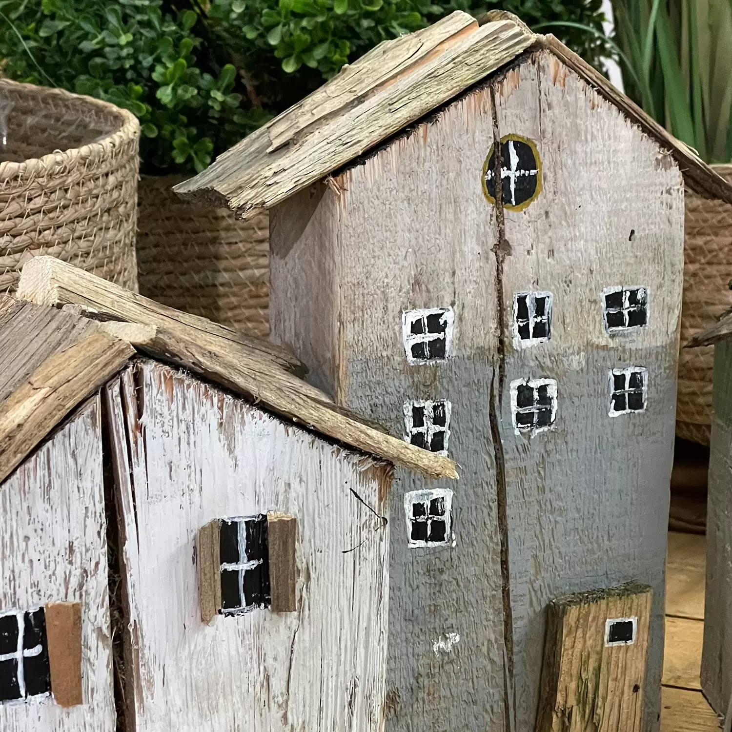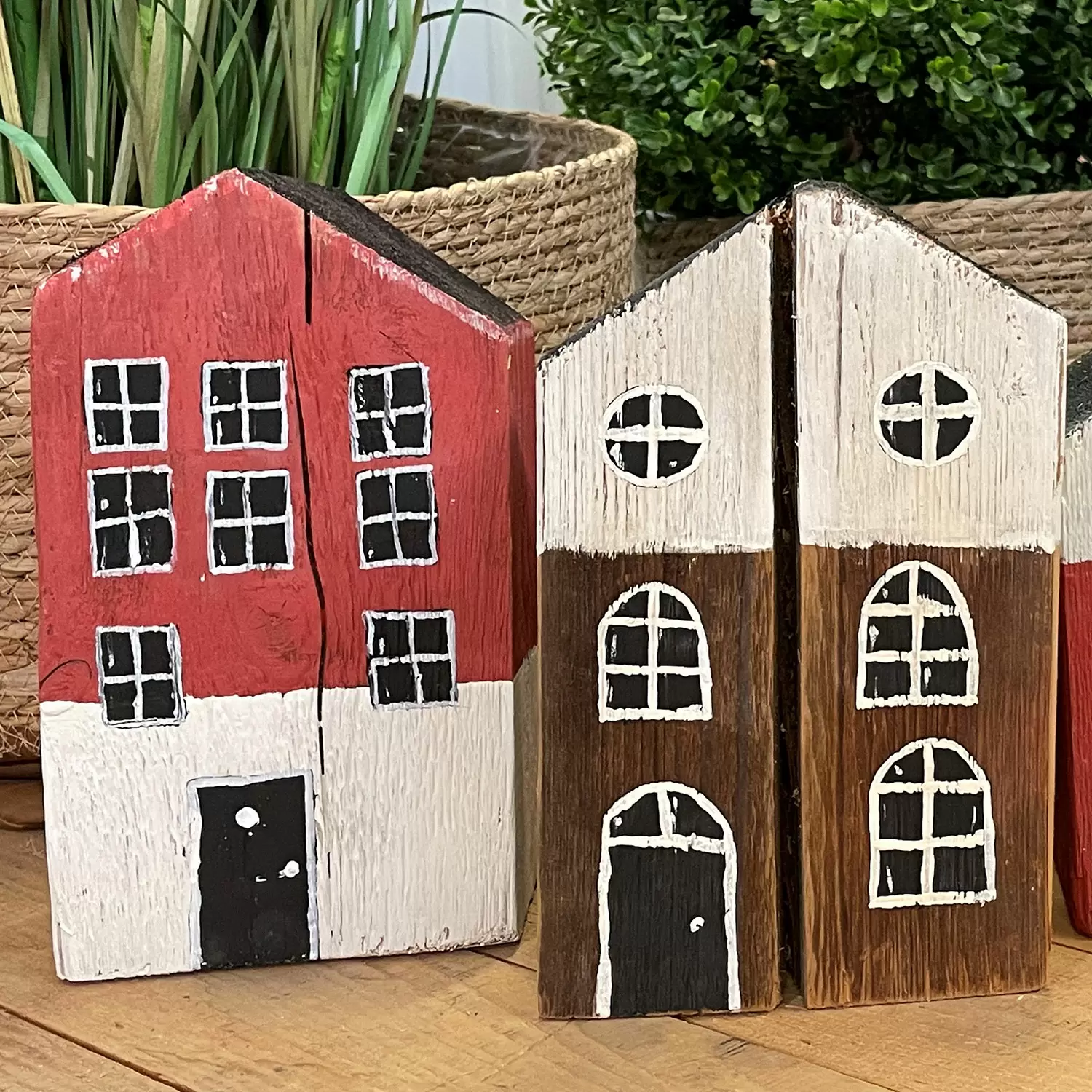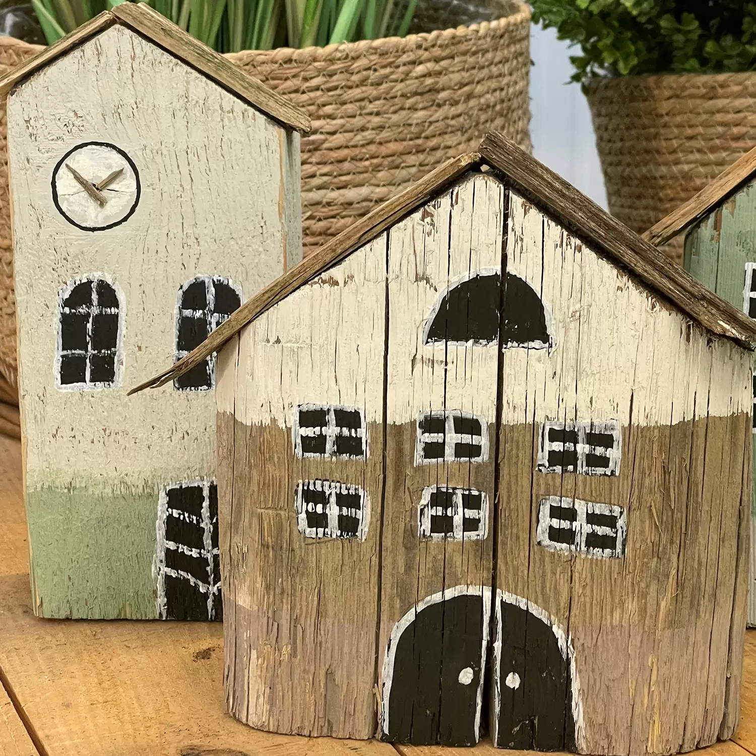 Diese schönen Häuser sind ganz aus massivem Altholz gefertigt und zwischen 20 bis 30 cm hoch. Sie können nach eigenen Farbwünschen bemalt und gestaltet werden. Jede/-r Teilnehmende stellt am Kurs drei Häuser her. Diese coolen Dekoobjekte sehen toll aus auf dem Sideboard, auf dem Büchergestell oder auf einem Couchtisch.