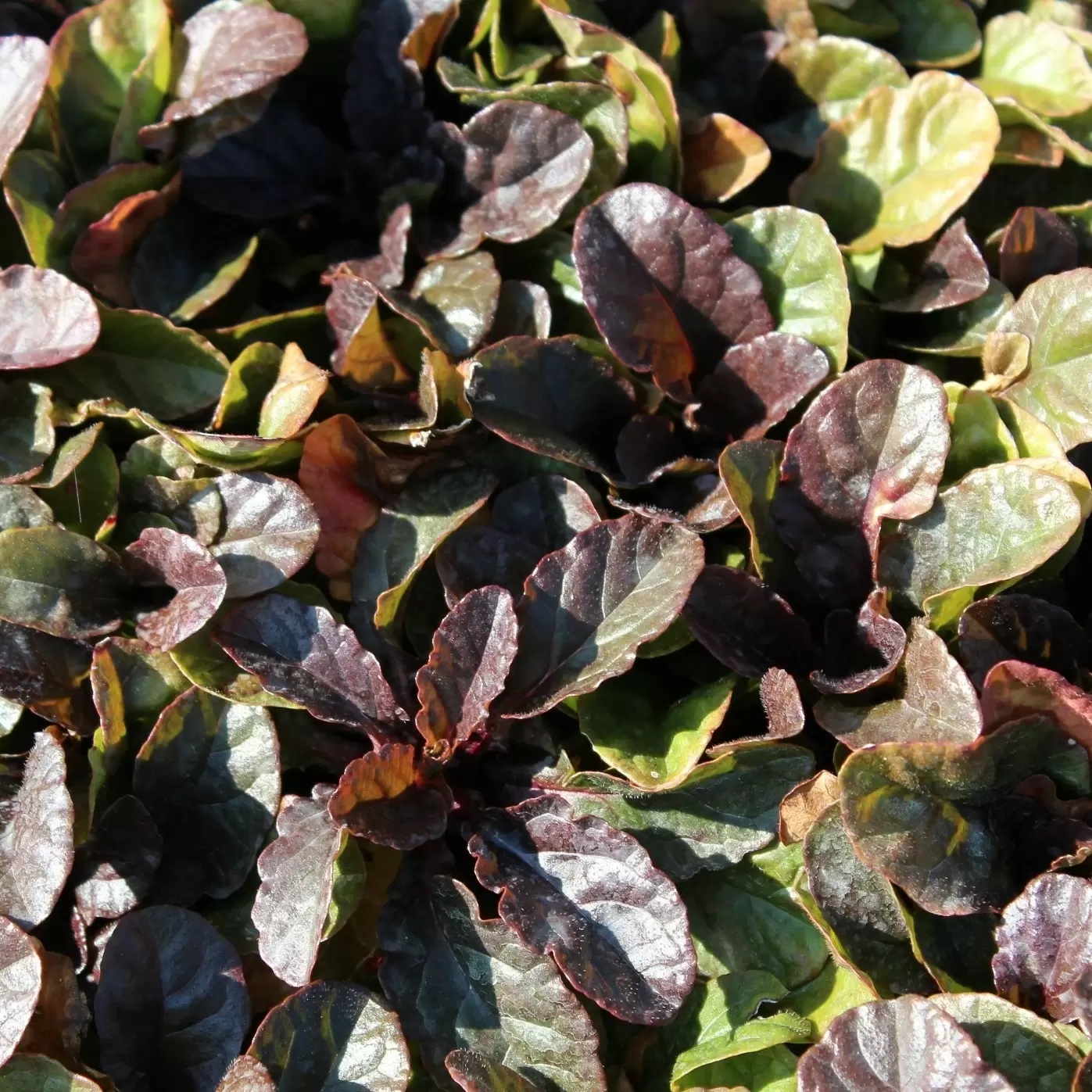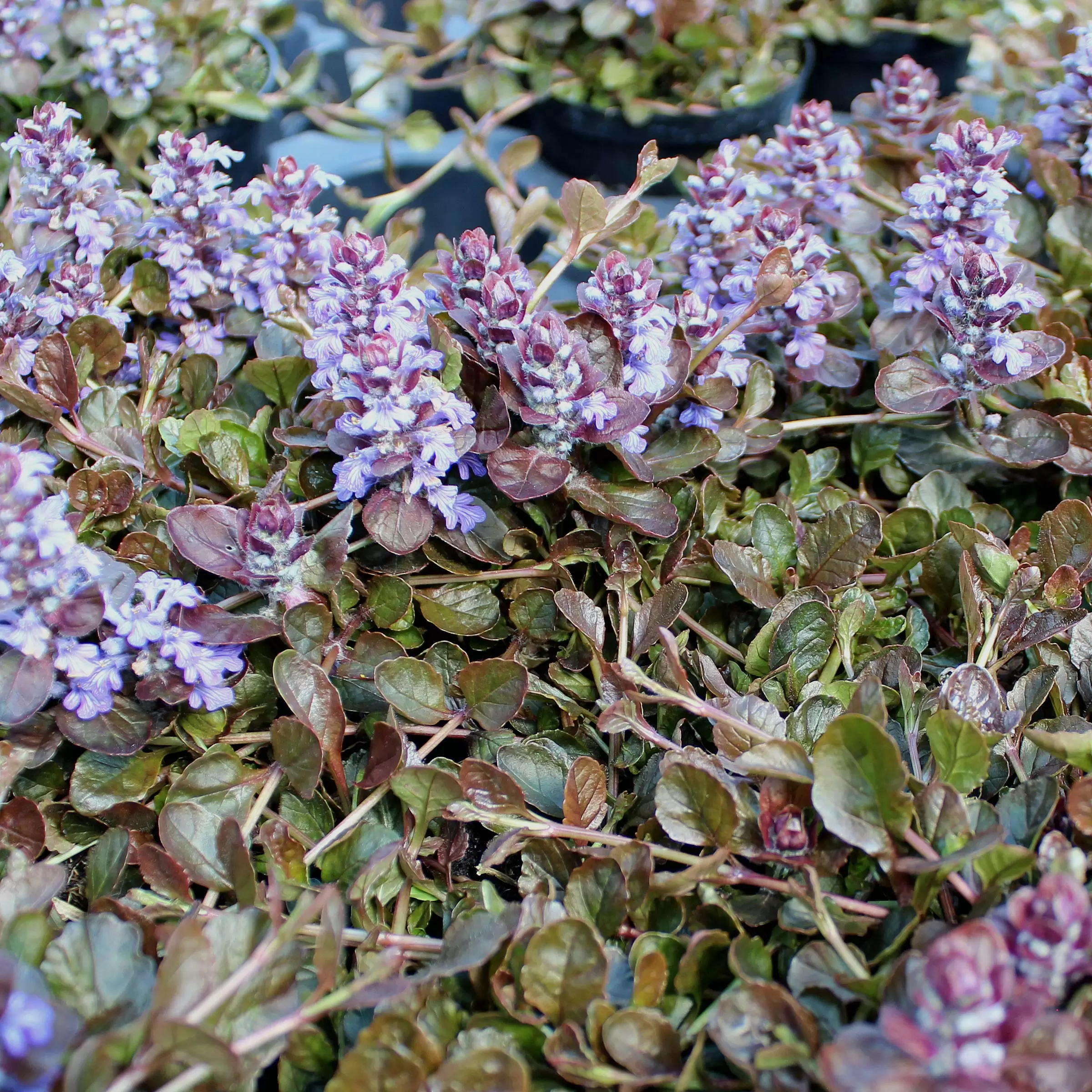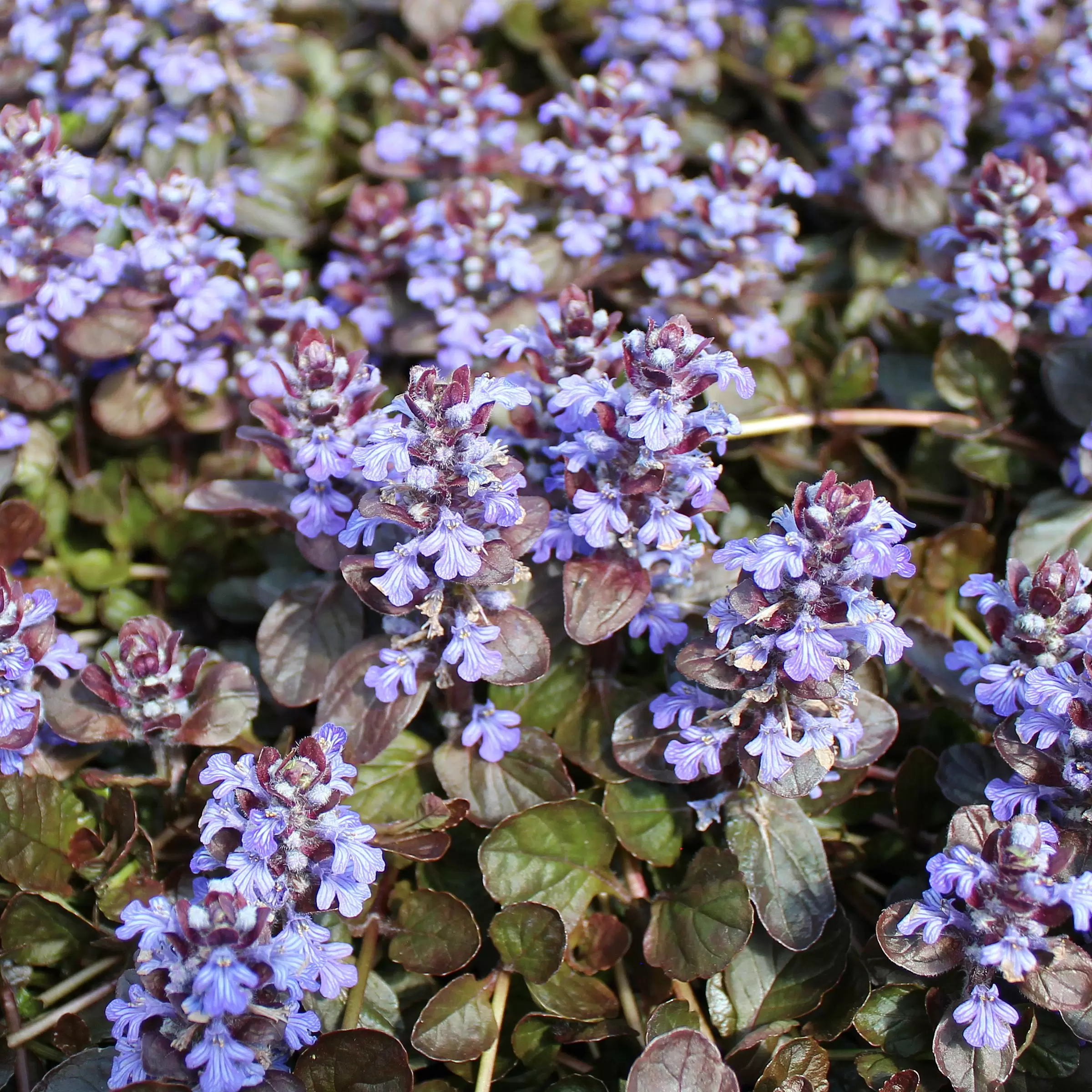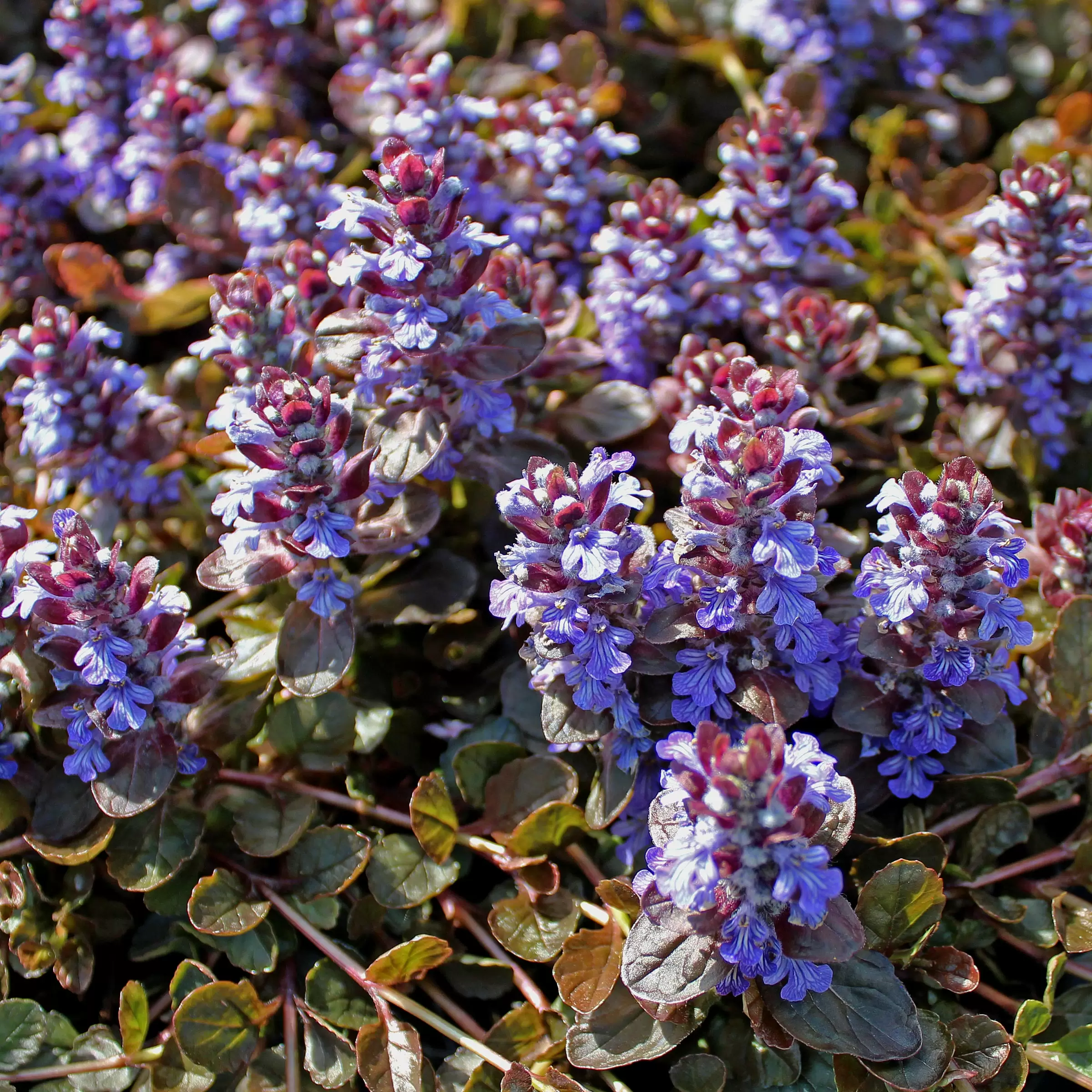 Der rotblättrige Günsel (Ajuga reptans 'Atropurpurea') macht violettblaue Blütenkerzen und bildet einen glänzenden, rotbraunen Blätterteppich. Er eignet sich gut als Bodendecker für feuchte, nährstoffreiche Böden und lockt zahlreiche Bienen und Insekten an.