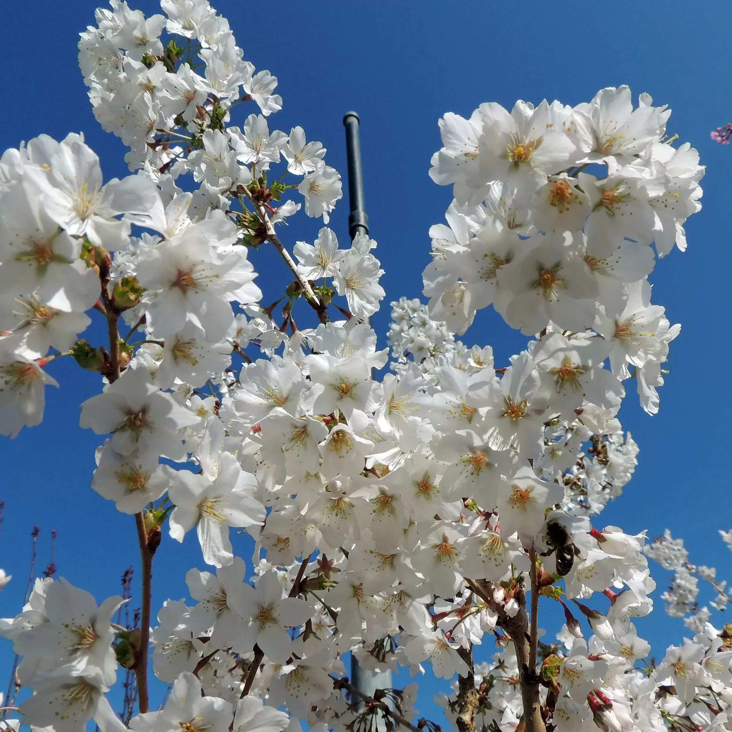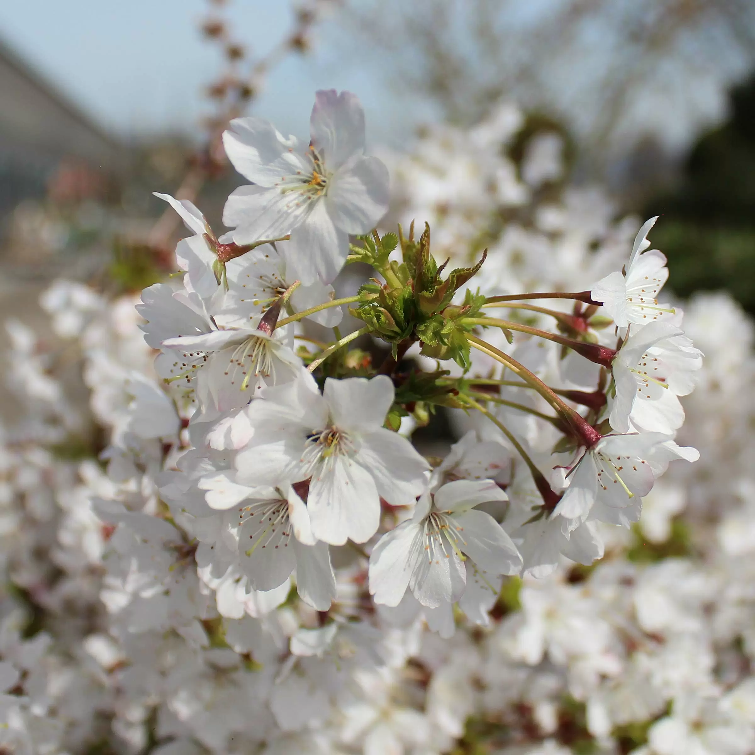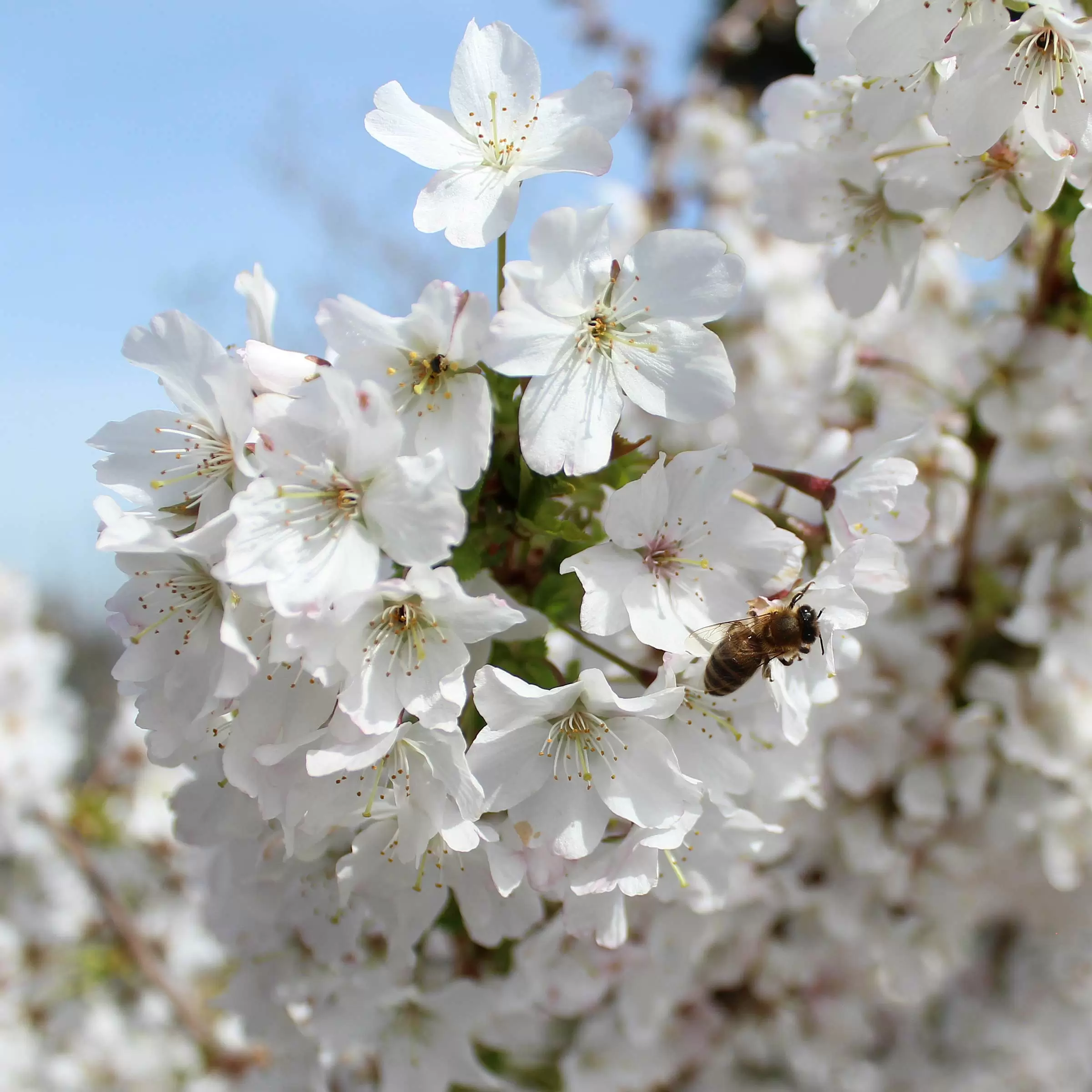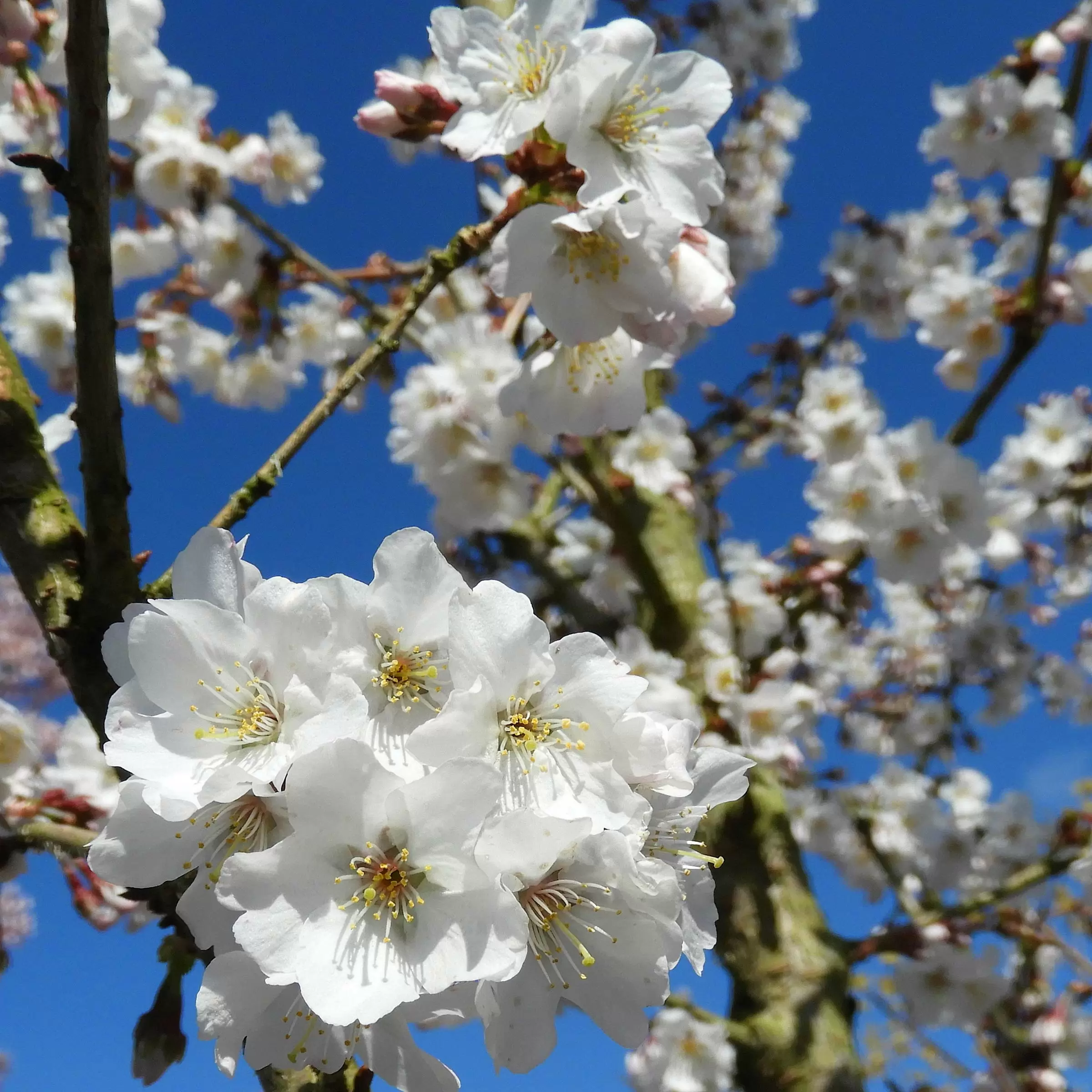- Weisse bis schwachrosa, einfache Blüten vor dem Blattaustrieb, die ausserordentlich zahlreich erscheinen