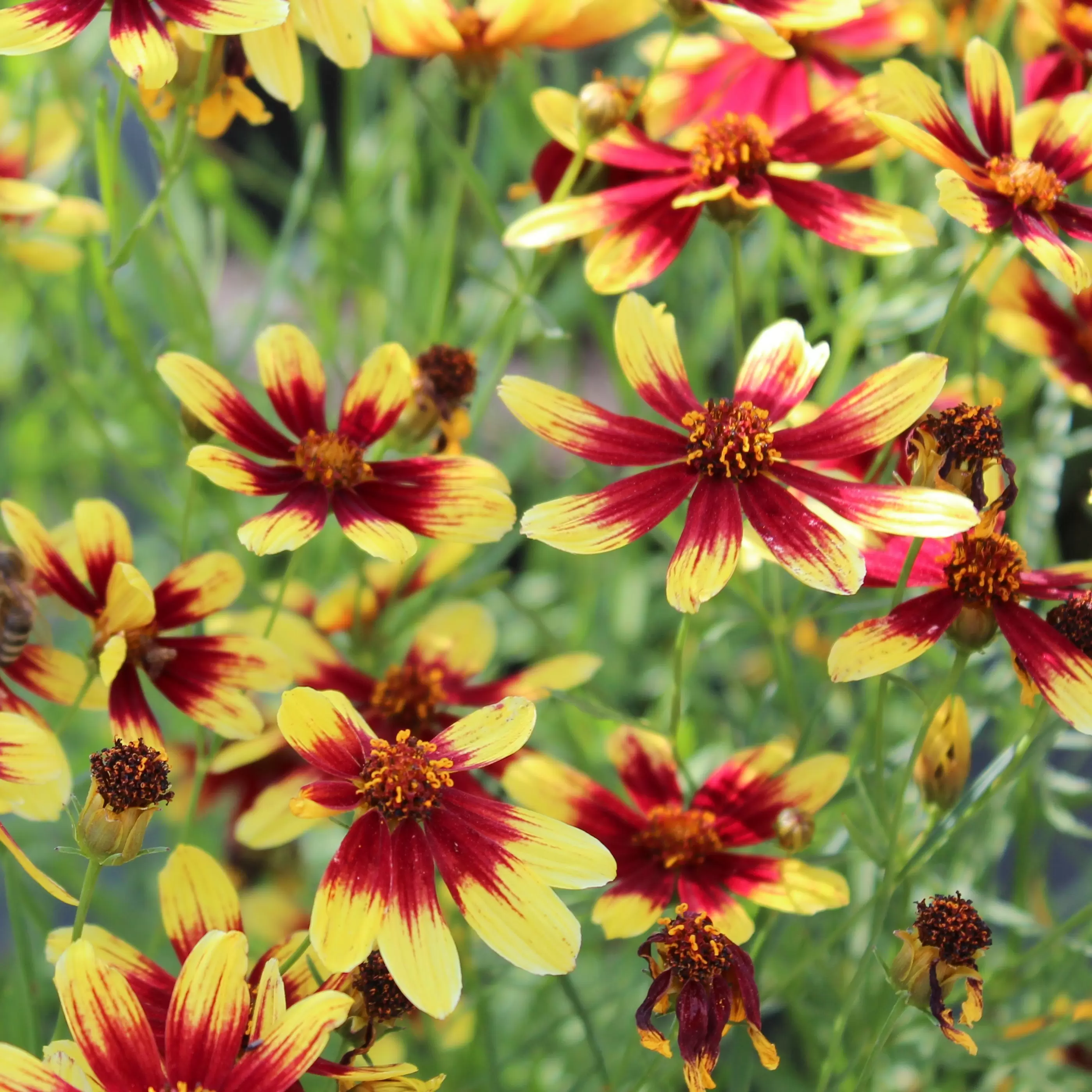 Das leuchtende Mädchenauge 'Bengal Tiger' (Coreopsis verticillata 'Bengal Tiger') erfreut mit langer Blütezeit und den schönen rot-gelben Blüten. Sie wird im Spätsommer von Bienen, Hummeln und Schmetterlingen besucht.