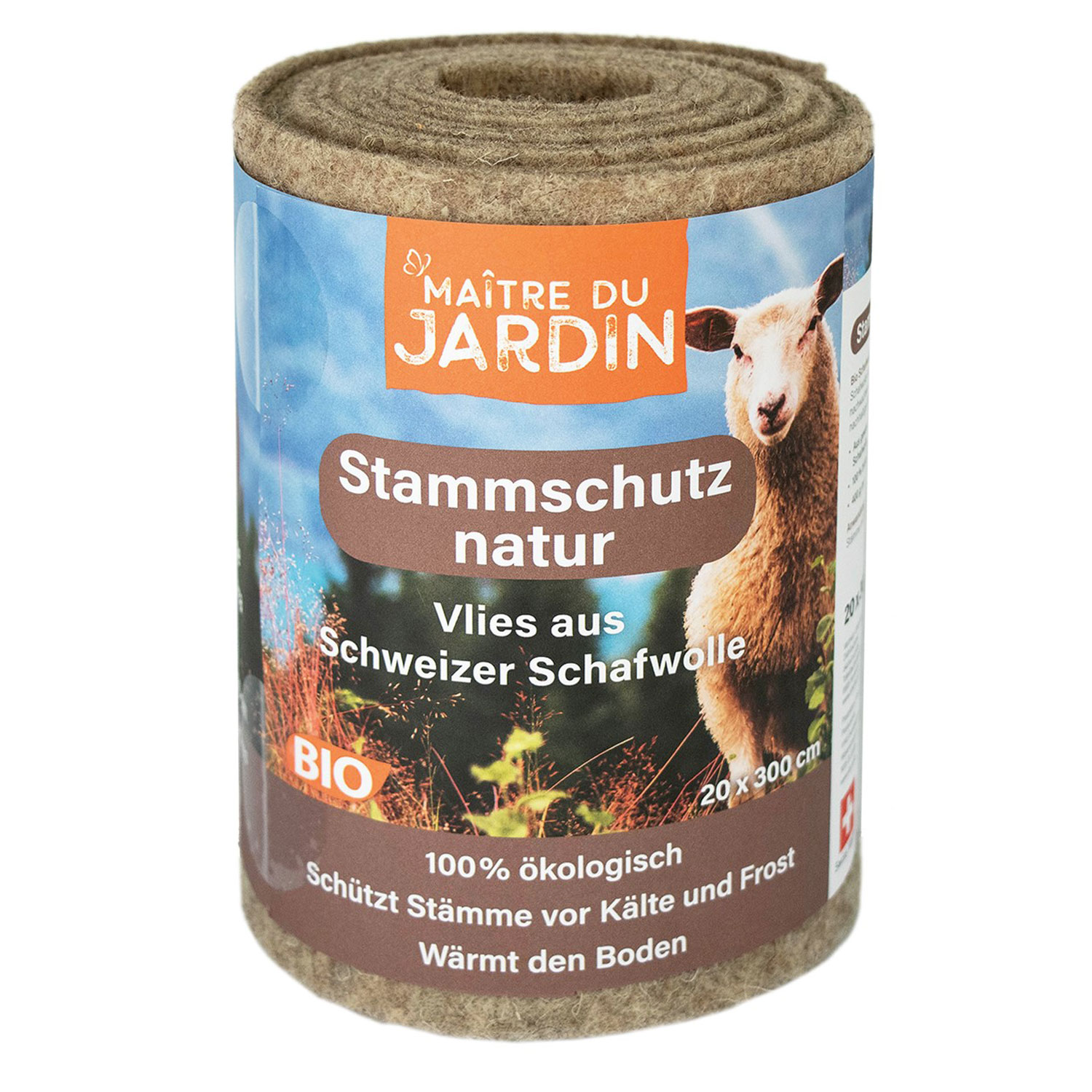 Dieses Vlies aus Schweizer Schafwolle schützt Stämme vor Kälte und Frost.