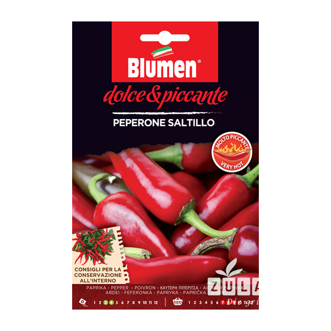 Peperone 'Saltillo' ist eine späte Paprika-Sorte mit grün-rötlichen Schoten. Die scharf schmeckenden Chili-Schoten haben eine Hornform und werden 2.5 - 4 cm lang. Sie wachsen in Büscheln angeordnet und können sowohl frisch, als auch getrocknet oder als Öl verwendet werden. Die Pflanze wird 50 - 60 cm hoch und wächst buschig.