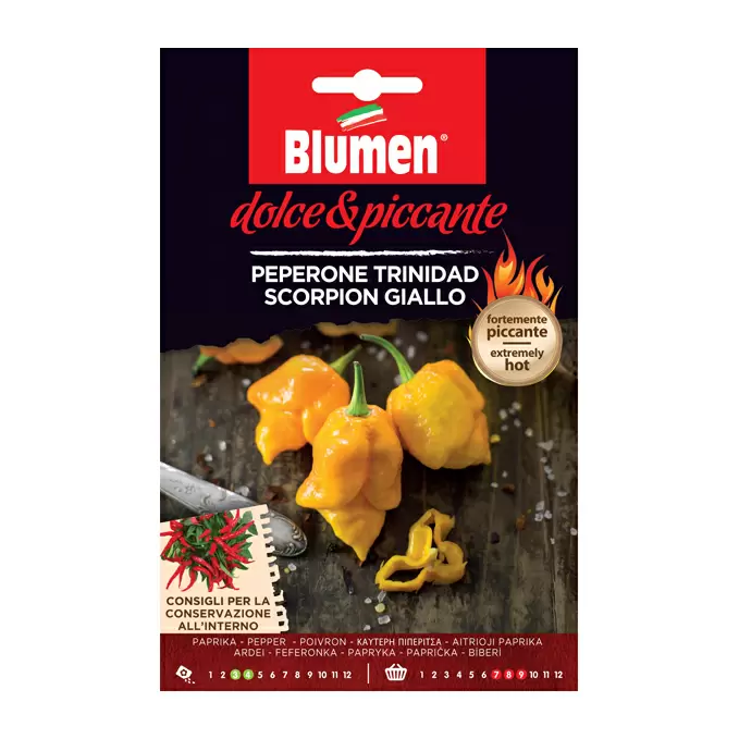 Peperone 'Trinidad Scorpion Giallo' hat 4 - 5 cm lange Früchte. Diese grünen Schoten verfärben sich mit dem Ausreifen zuerst orange, dann leuchtend gelb. Trinidad Scorpion Giallo gehört zu den schärfsten Paprika-Sorten der Welt, mit einem Schärfegrad bis 2 Millionen Scoville. Die Pflanze eignet sich besonders gut für den Anbau in Töpfen.