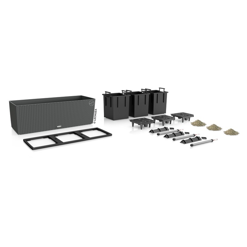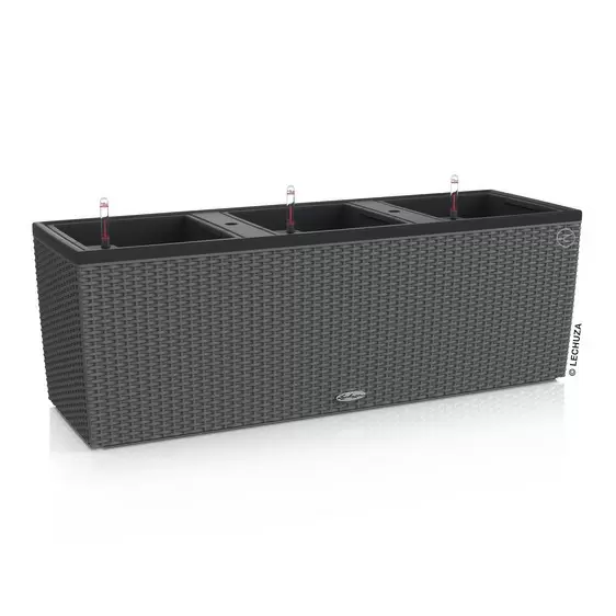 Das stilvolle Pflanzengefäss Trio Cottage ist ein grosser, langer Blumentopf mit ansprechender Flecht-Struktur. Es eignet sich optimal zur Verwendung als Sichtschutz und um rankendes Obst oder Gemüse anzubauen. Im Set sind drei grosse Pflanzeinsätze enthalten, die dank den innovativen Tragegriffen einfach ausgetauscht werden können. Die integrierten Wasserstandsanzeiger zeigen bei jedem Pflanzeinsatz, ob im Wasserreservoir noch Wasser enthalten ist. Bei einer Verwendung im Aussenbereich kann die Schraube auf der Unterseite der Pflanzeinsätze entfernt werden, damit überschüssiges (Regen-) Wasser ablaufen kann. Mit Lechuza Trio Cottage wird die Pflege Ihrer Gartenpflanzen einfach wie noch nie.