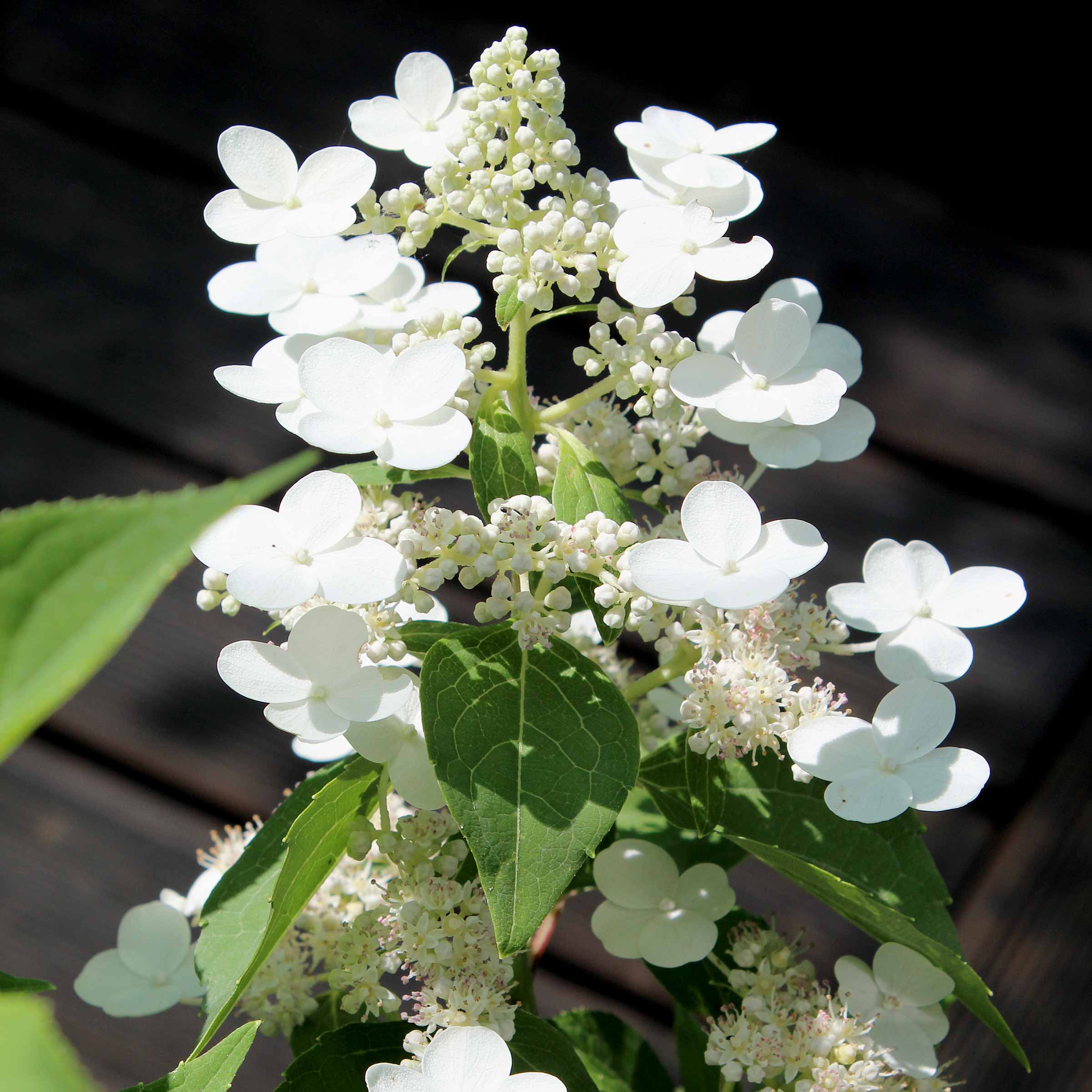 Die Rispen-Hortensie 'Dharuma' (Hydrangea paniculata 'Dharuma') ist ein niedrig wachsender Kleinstrauch mit zahlreichen weissen Blütenrispen, die sich später rötlich verfärben.
