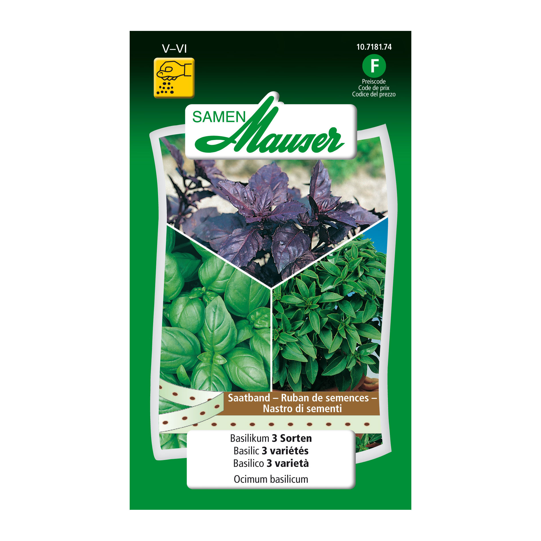 Das Basilikum-Saatband (Ocimum basilicum) enthält eine großblättrige, eine feinblättrige und eine dunkelrote Basilikum-Sorte. Die Samen können zwischen Mai und Juni ganz einfach ausgesät werden. Das Saatbeet muss stets feucht gehalten werden und die Samen leicht mit Erde bedeckt werden. Die Keimdauer beträgt 14 - 20 Tage. Basilikum ist sehr wärmebedürftig. Daher empfiehlt sich ein sonniger, warmer Standort. Geerntet werden kann zwischen Juni und Oktober.