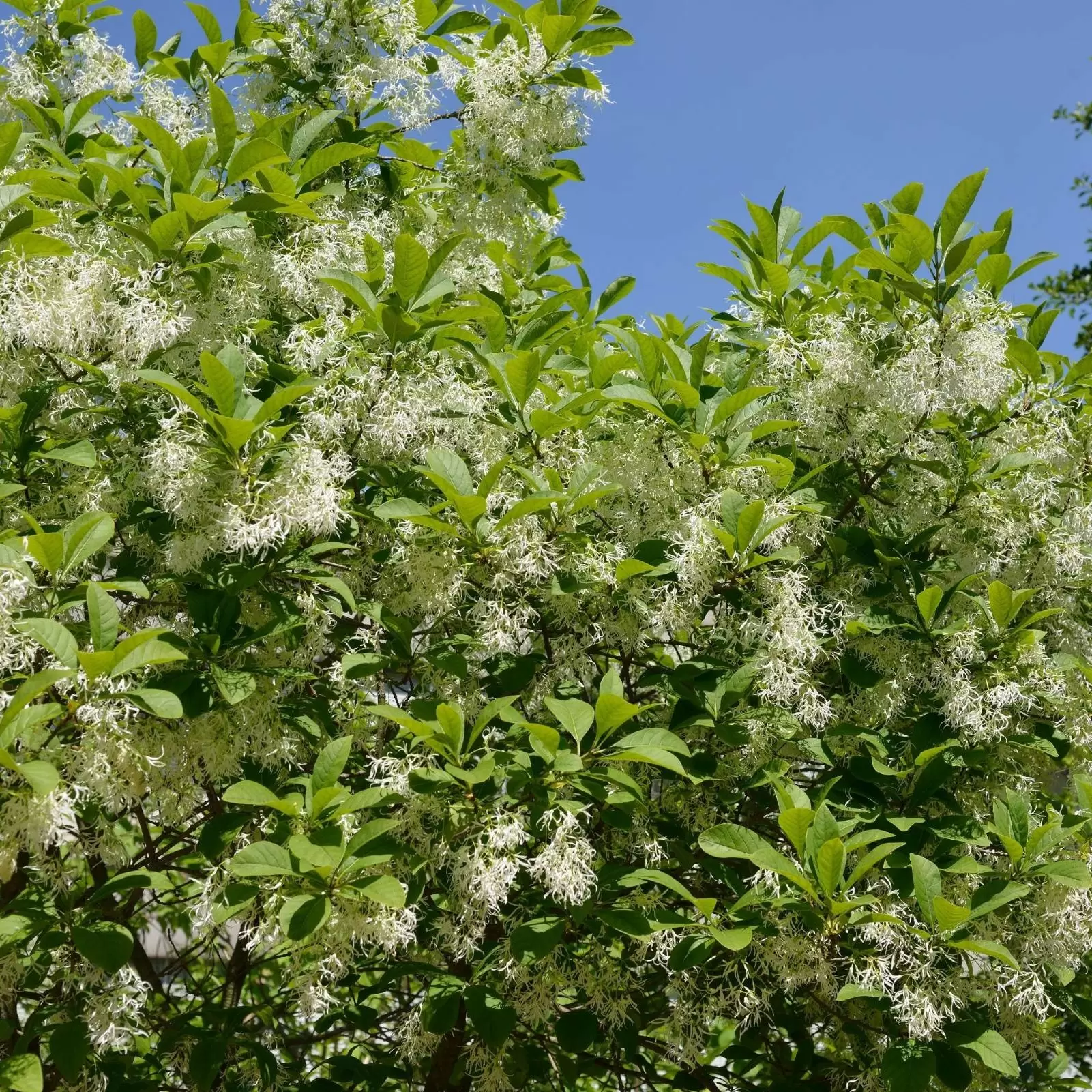 Der Schneeflockenstrauch (Chinonanthus virginicus) zeigt an einem sonnigen Standort viele weisse Blüten. Er ist stadtklimafest und rauchhart.