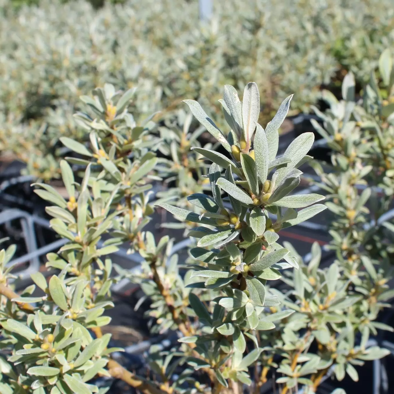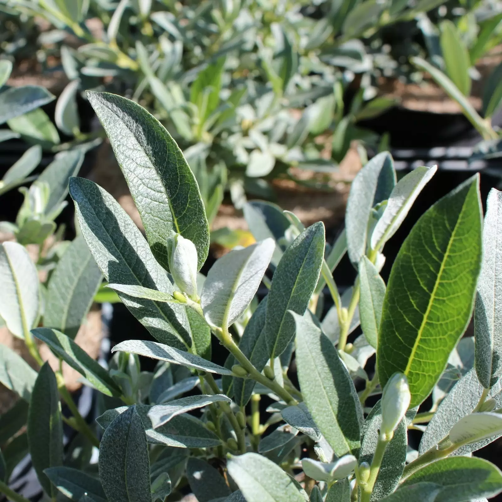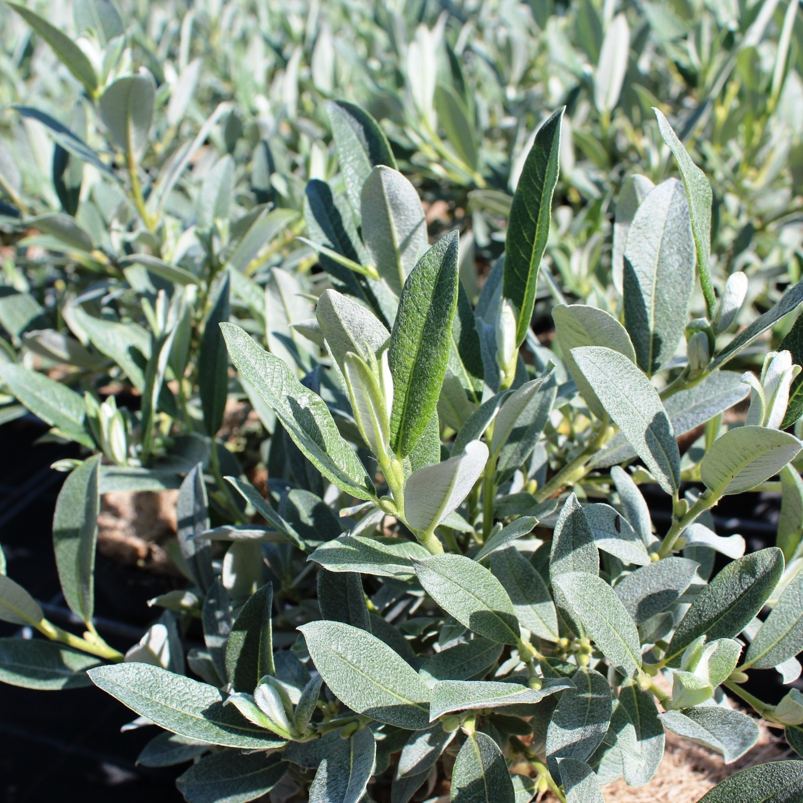 - Die langovalen Blätter sind auf der Oberseite glänzend grün, auf der Unterseite seidig bis grauwollig behaart. Aus der Ferne hat das Laub einen grausilbrigen Farbton.