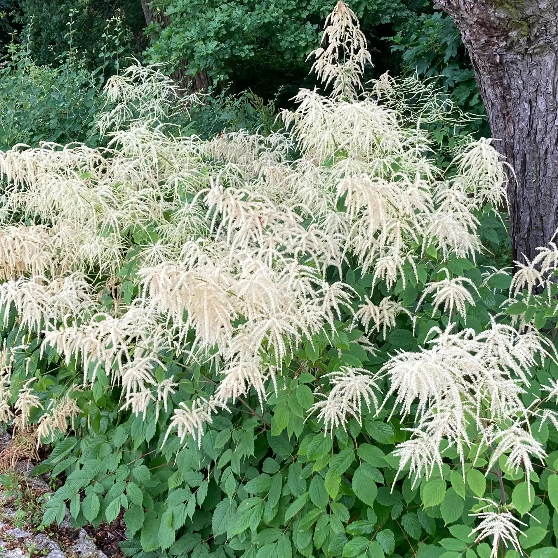 - Von Anfang Juni bis Ende Juli erscheinen bis zu 50 cm lange, lockere, cremweisse Blütenrispen, die über dem Laub stehen und einen blendenden Kontrast zum Blattwerk bilden.