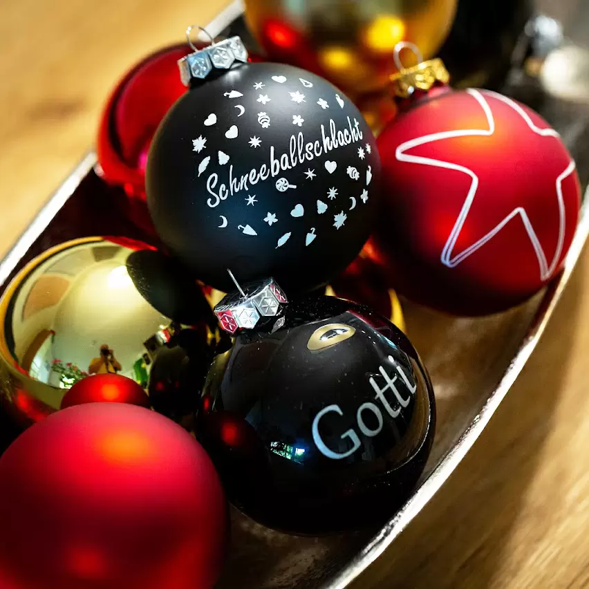 Die Kinder dürfen sich eine Weihnachtskugel (bruchfest) aussuchen und entscheiden, ob sie einen Begriff (Gotti, Opa, Mama, Bruder etc.) auf der Kugel möchten. Dazu gibts verschiedene Sujets, mit denen die Kugeln dekoriert werden können. Der Begriff wird auf Wunsch gerne durch uns aufgeklebt.