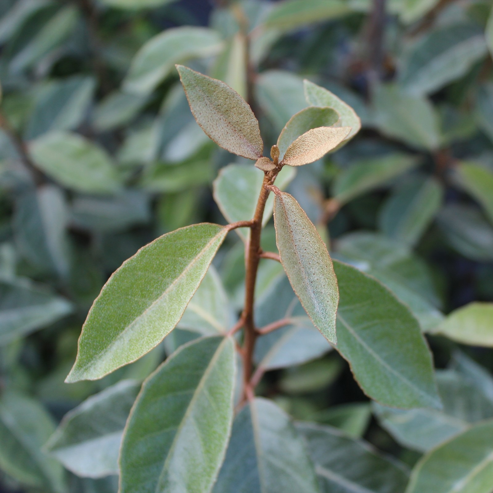- dunkelgrün glänzende, längliche Blätter, Unterseite silbrig bleibend.