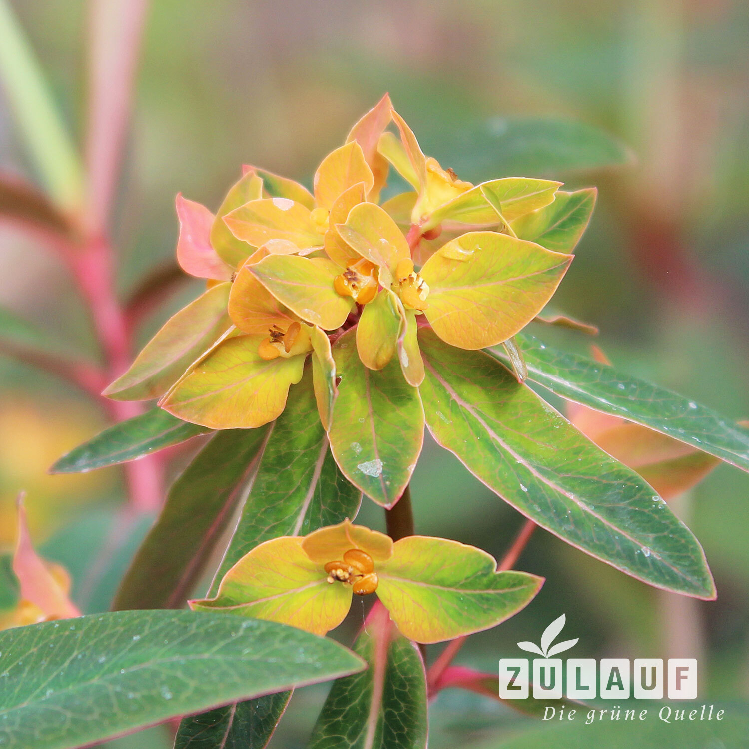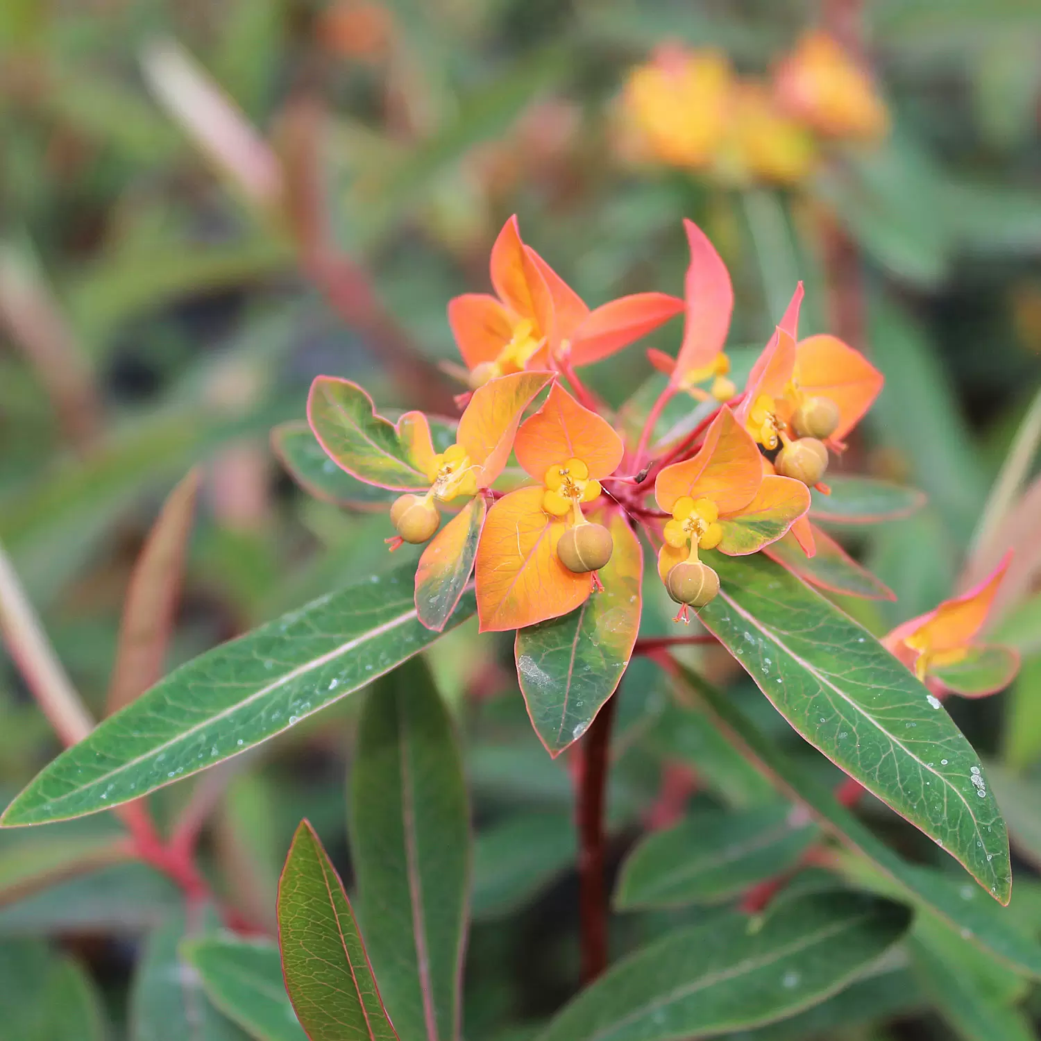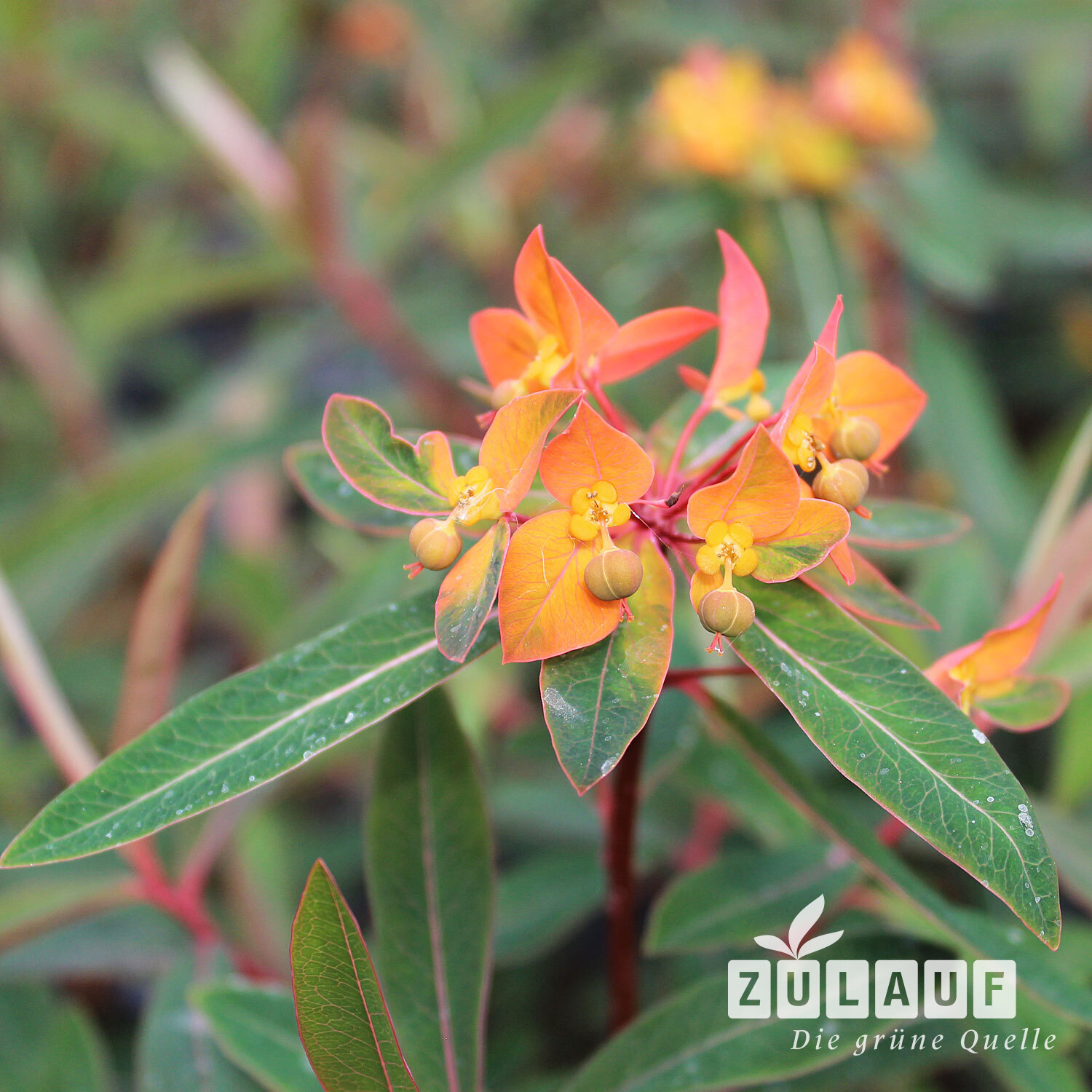 Die Wolfsmilch 'Fireglow' (Euphorbia griffithii 'Fireglow') ist eine pflegeleichte Staude. Ihre auffälligen, leuchtend orangeroten Hochblätter sind um die kleinen Blüten herum. Die Staude ist eine wichtige Bienenweide.