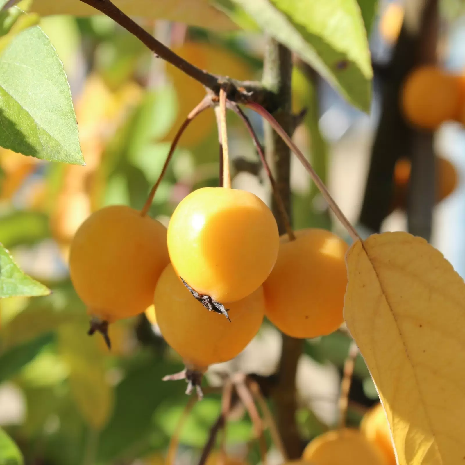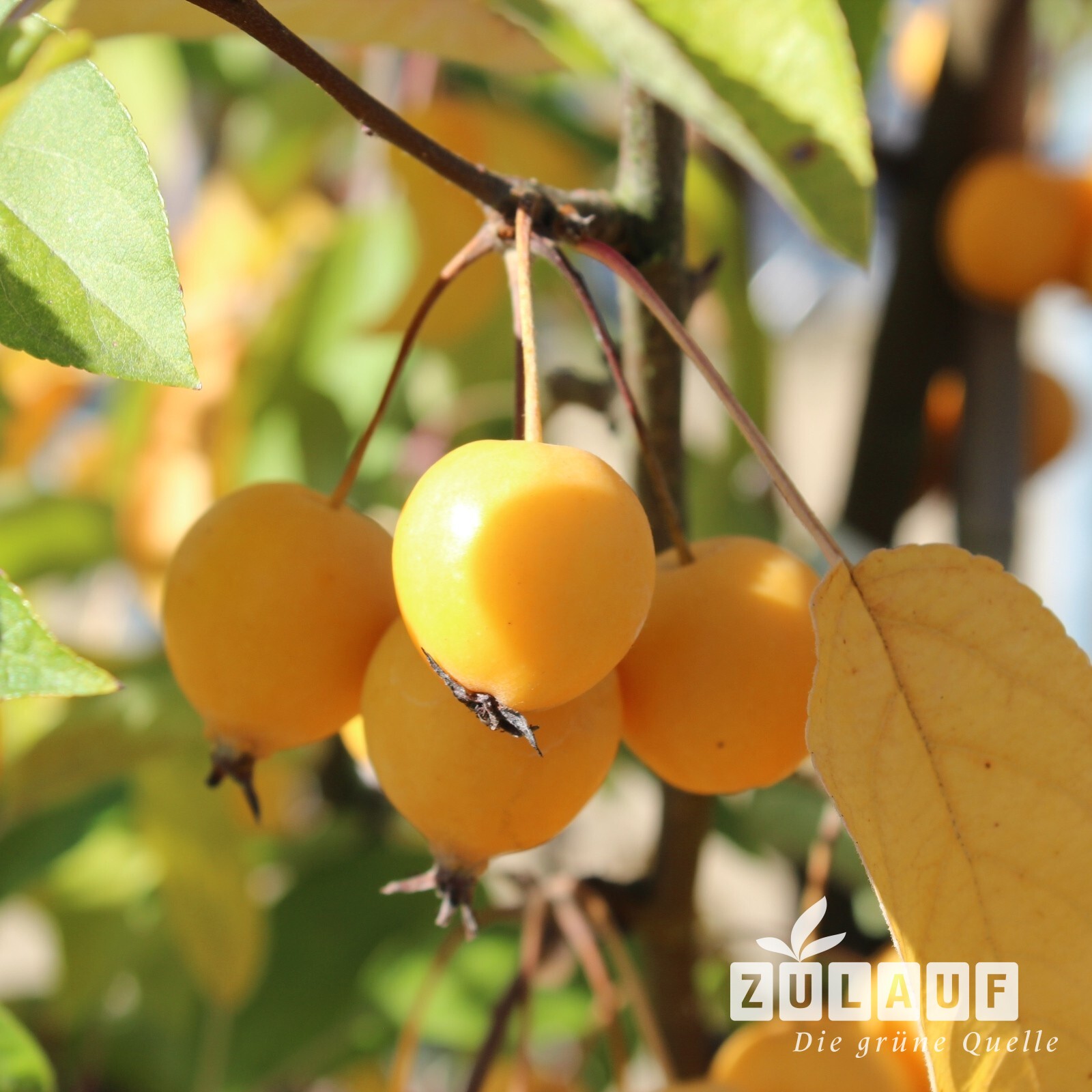 - Die kleinen, kugeligen Früchte sind knallgelb bis hell orange und essbar. Jedoch können sie geschmacklich mit den Kulturäpfeln nicht mithalten.